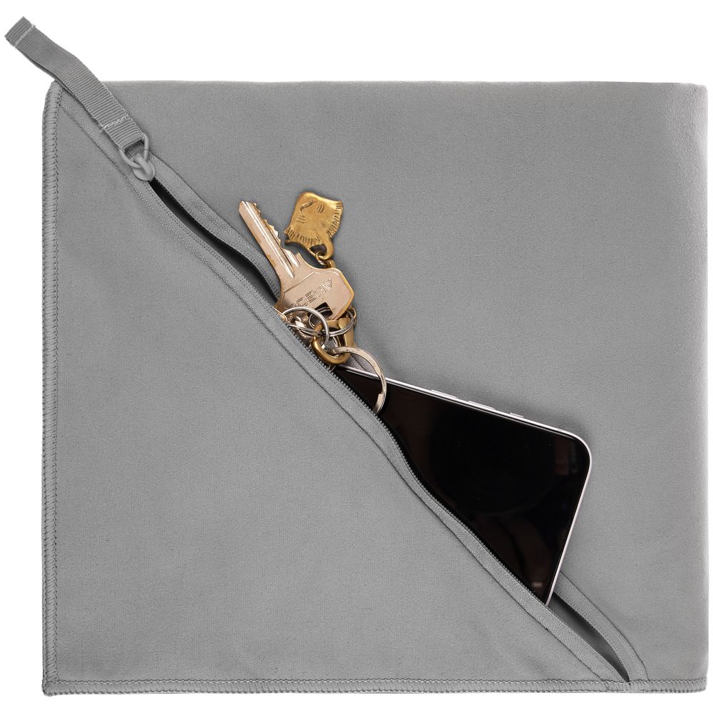 Модель имеет удобный карман на молнии в одном из углов для хранения мелочей или защиты телефона от песка на пляже.Полотенце упаковано в сумку-чехол из прочной ткани «рипстоп» с дышащим сетчатым верхом. Чехол также можно использовать в качестве несессера для косметических и купальных принадлежностей, и при помощи карабина — прикрепить к рюкзаку или сумке.