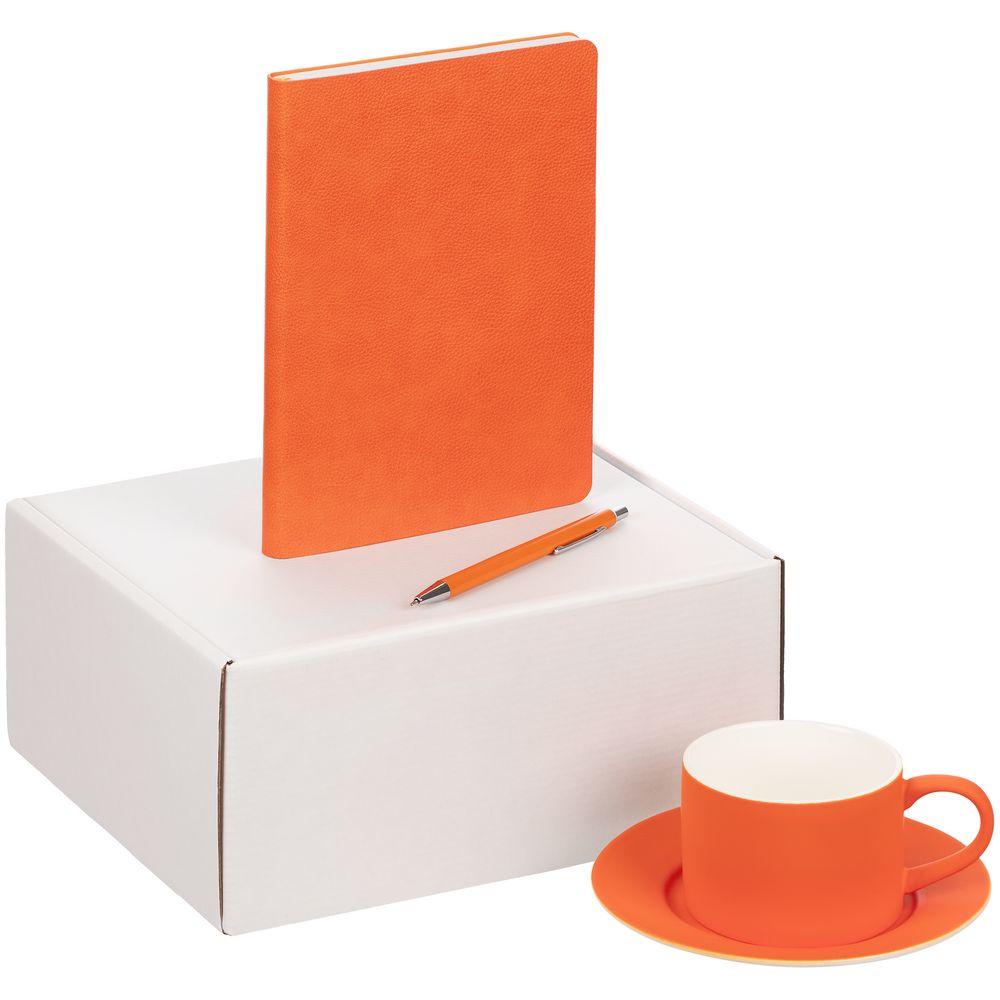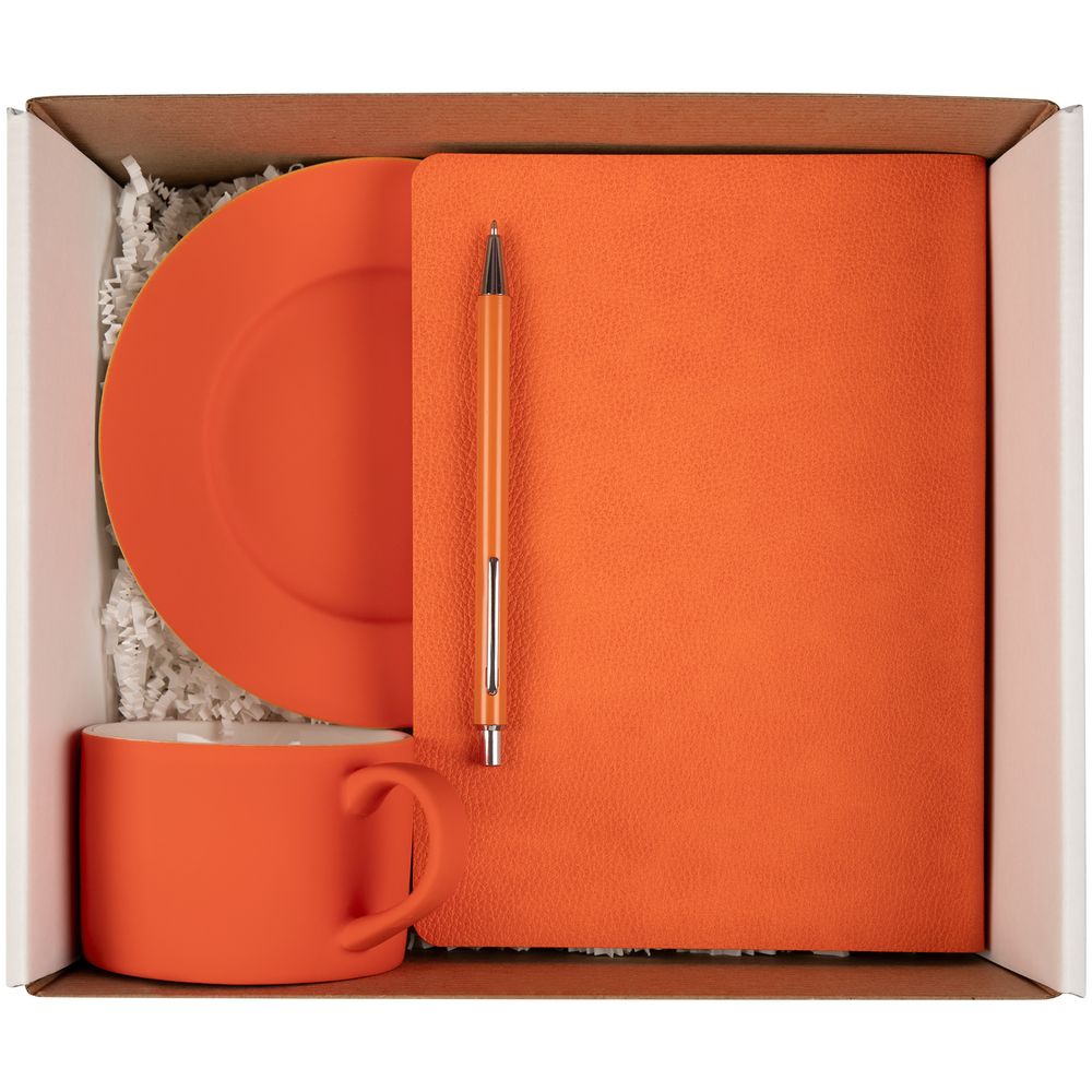 ежедневник - искусственная кожа; чайная пара - фарфор, покрытие соф-тач; ручка - металл; коробка - микрогофрокартон