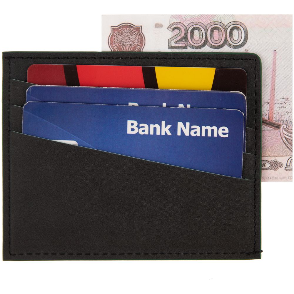 Чехол выполнен из материала Soft Touch Pearl, черный АА, дополнен окрашенным срезом края и внутренним карманом из цветного картона. Имеет 4 отделения для кредитных карт и 1 отделение для купюр.
