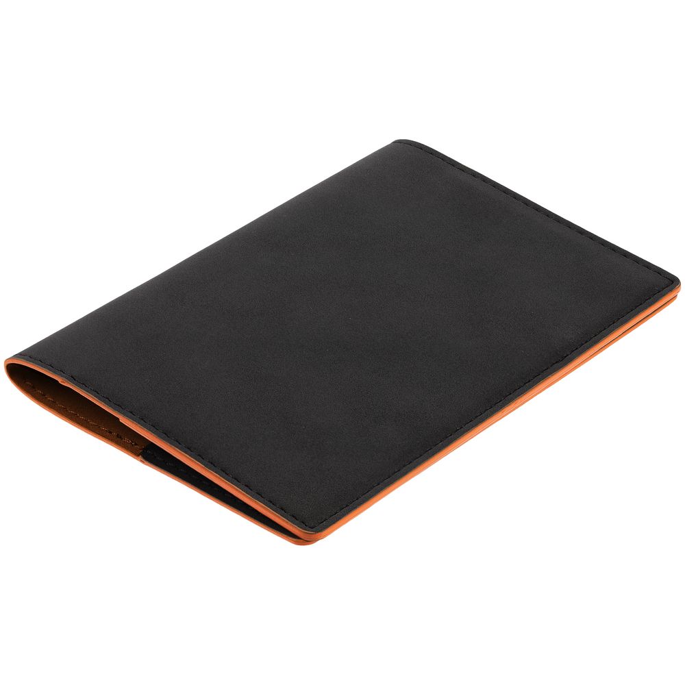 Обложка выполнена из материала Soft Touch Pearl, черный АА и срез обложки окрашен в цвет внутреннего материала Latte, оранжевый ОО.