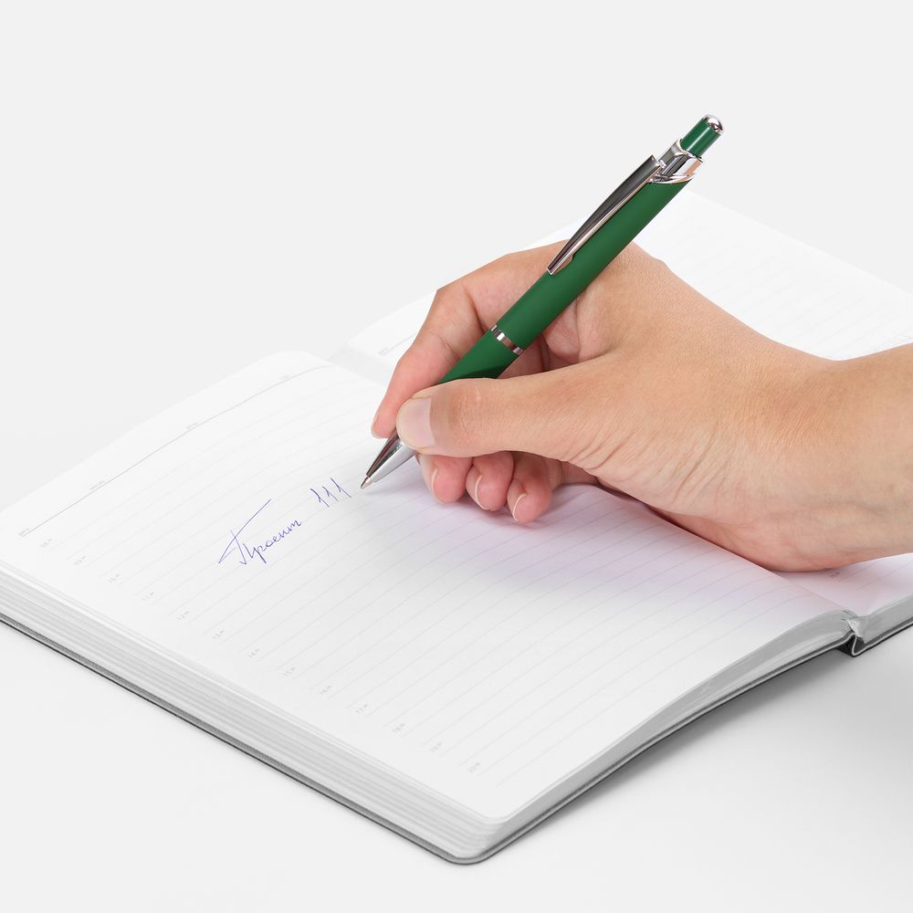 Металлическая ручка с покрытием софт-тач и серебристыми деталями.