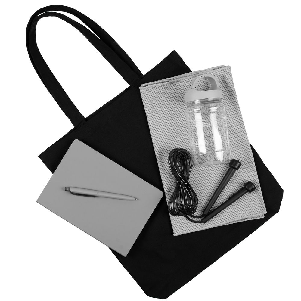 скакалка - ПВХ, пластик; полотенце - полиэстер; ежедневник - искусственная кожа, покрытие софт-тач; ручка - пластик, покрытие софт-тач; сумка - хлопок 100%, покрытие софт-тач