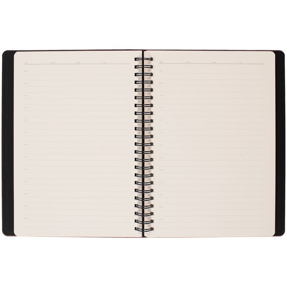 Ежедневник с блоком на пружине в твердой обложке, выполнен из материалов Nubuk Touch, винный SS и Soft Touch, черный AA.