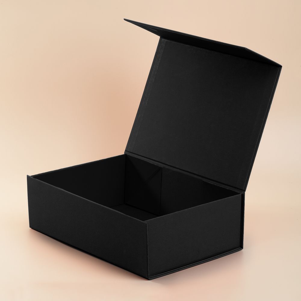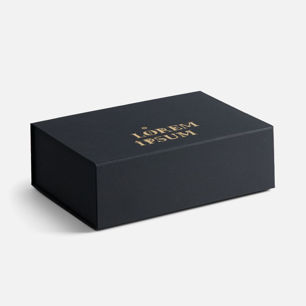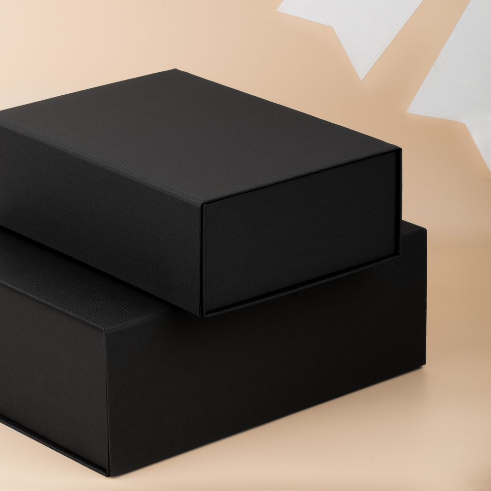 Коробка из переплетного картона, кашированного тисненой тонированной в массе бумагой, с крышкой на магните.