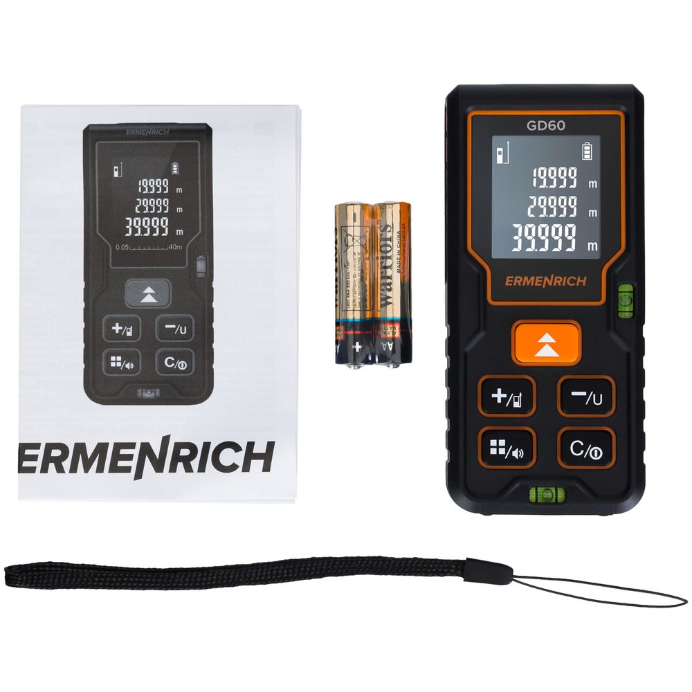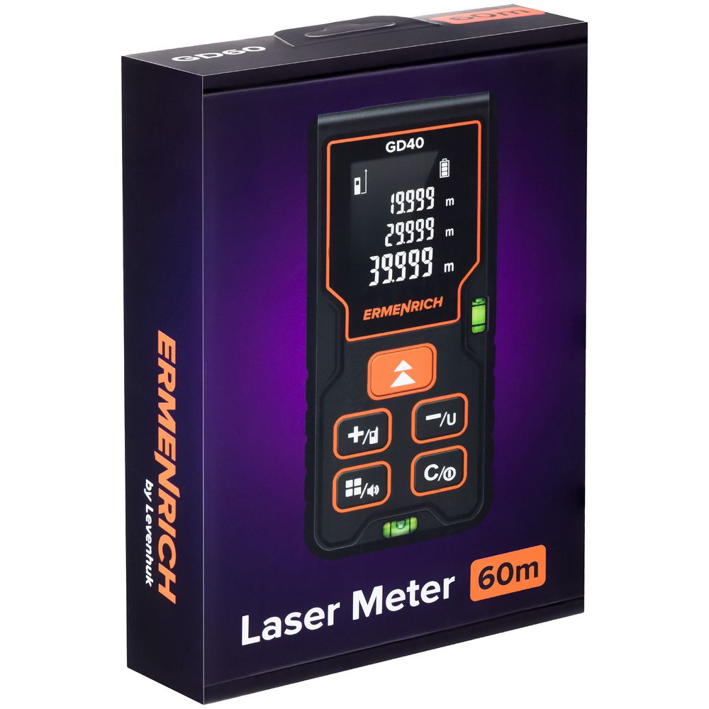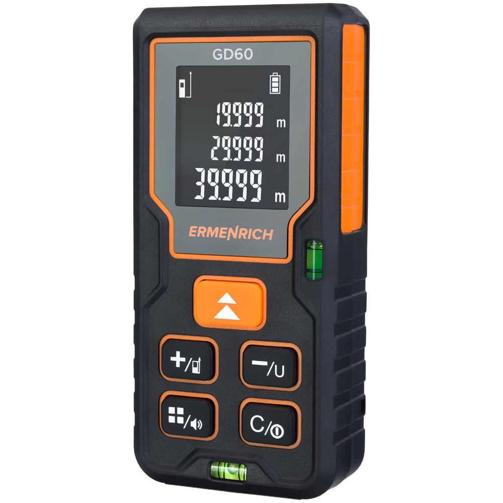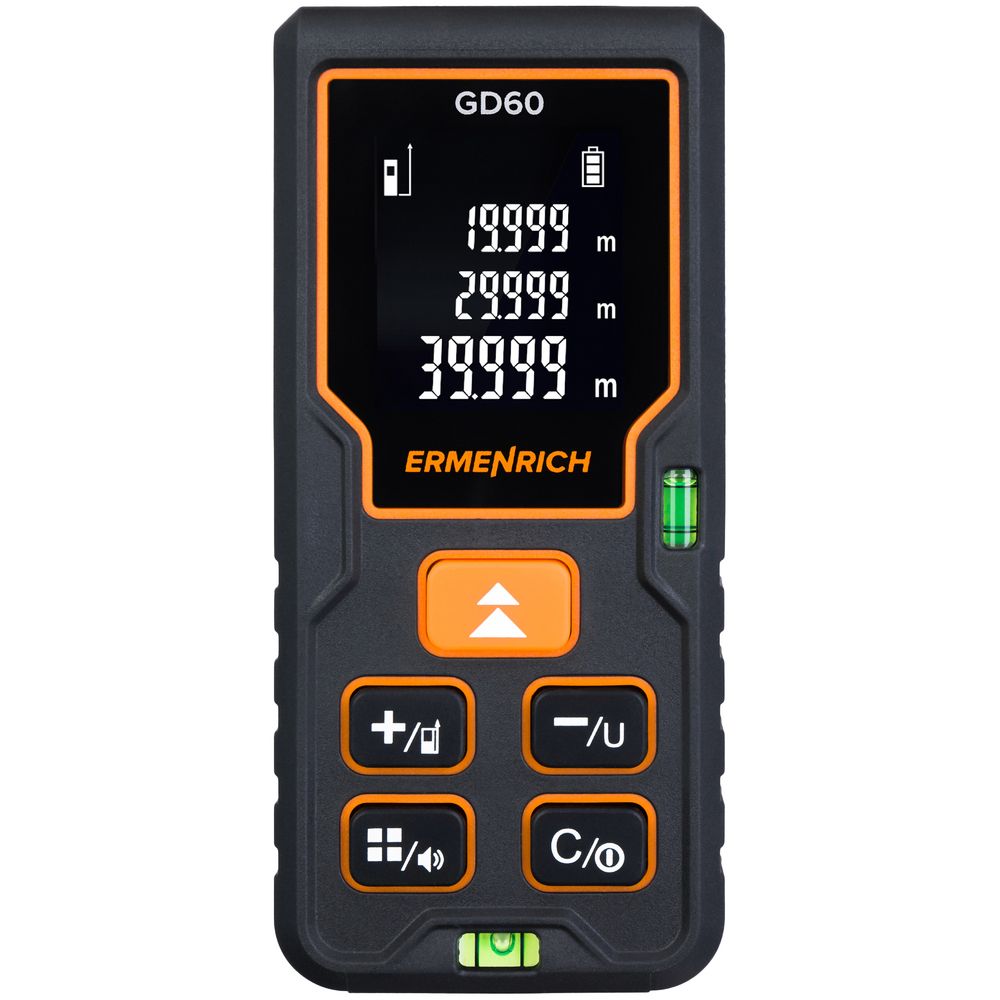 Ermenrich Reel GD60 — лазерная рулетка для самого широкого применения при измерении линейных размеров, площадей и объемов помещений, зданий и сооружений. Пригодится для уточнения линейных размеров помещений и деталей, а также их площадей и объемов.