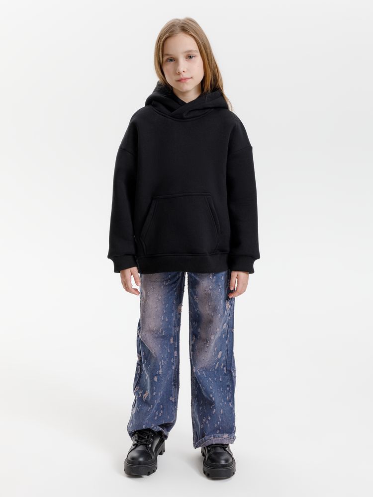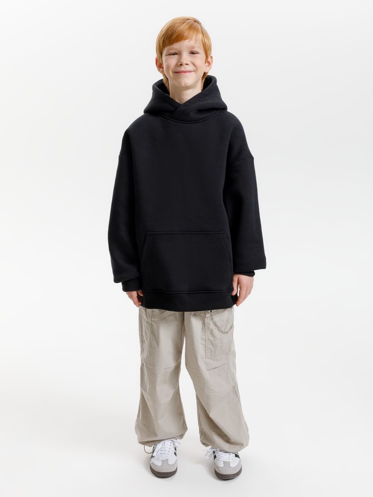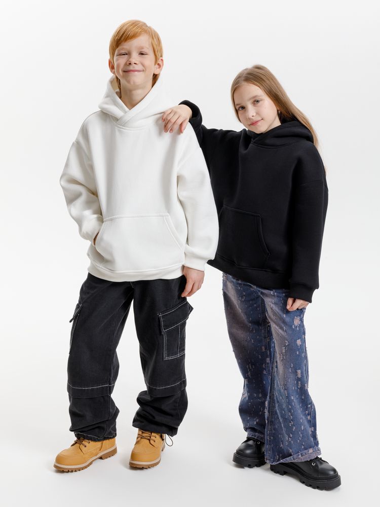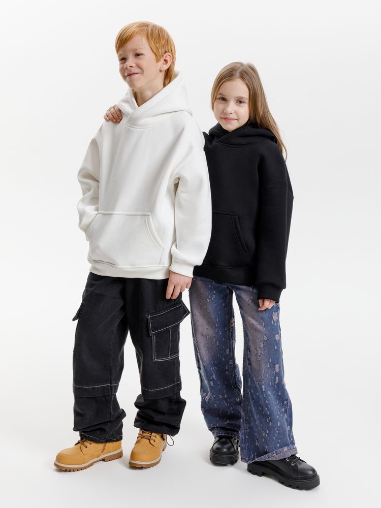 Детское худи унисекс со спущенным плечом и карманом-кенгуру.