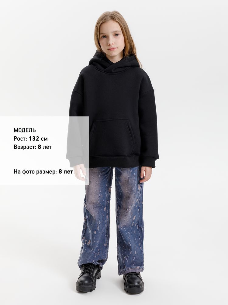 Детское худи унисекс со спущенным плечом и карманом-кенгуру.