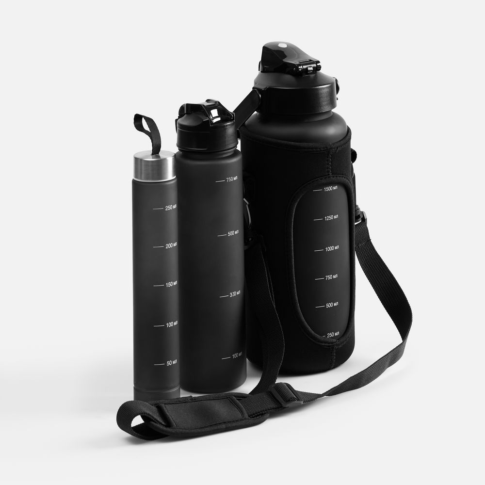 «Папа, мама, я — спортивная семья!». Набор спортивных бутылок Aquapack — настоящая находка: это три емкости разного объема, вложенные одна в другую по принципу матрешки. Прочные и эстетичные бутылки с черным матовым покрытием подойдут для тренировок, спортивных мероприятий, туристических походов и семейных пикников на природе.