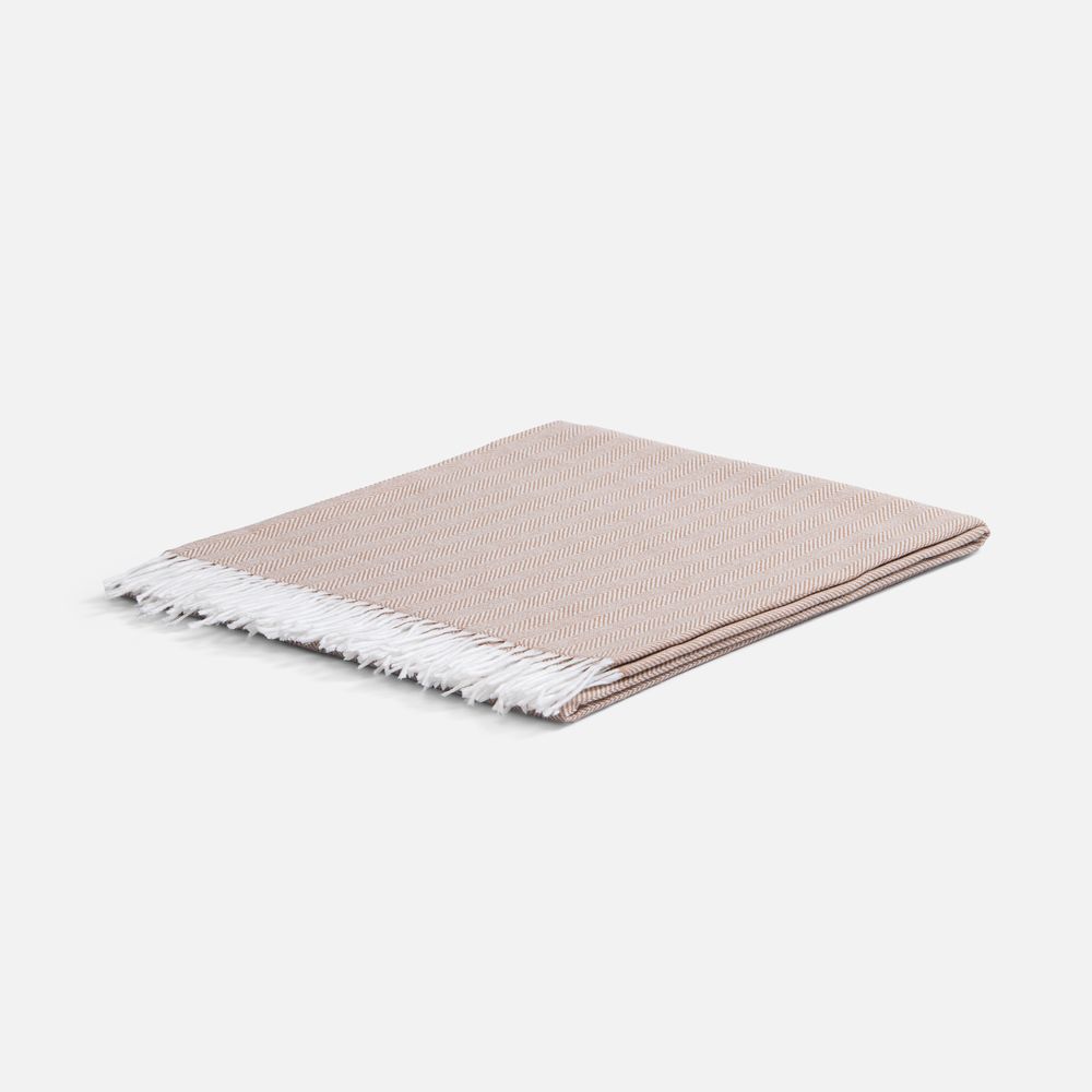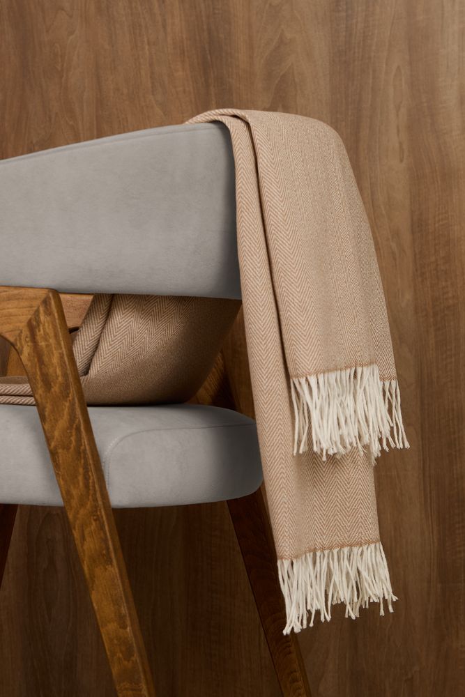 Классический рисунок «елочка» не слишком привлекает внимание, но в то же время добавляет изюминки. Смешанный состав пряжи продлевает срок службы и существенно облегчает уход за пледом.
