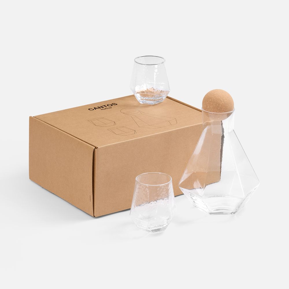 графин - боросиликатное стекло; стаканы - стекло, закаленное; крышка-шар - пробка; коробка - картон