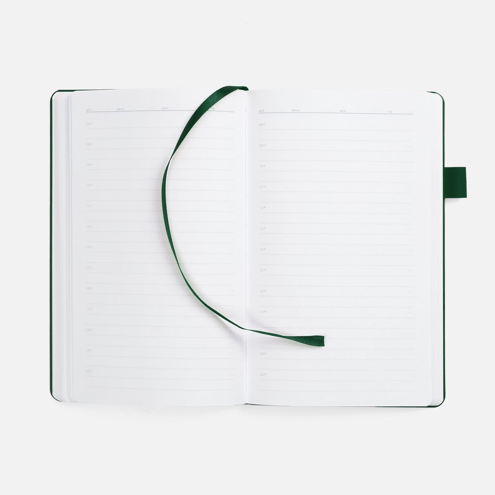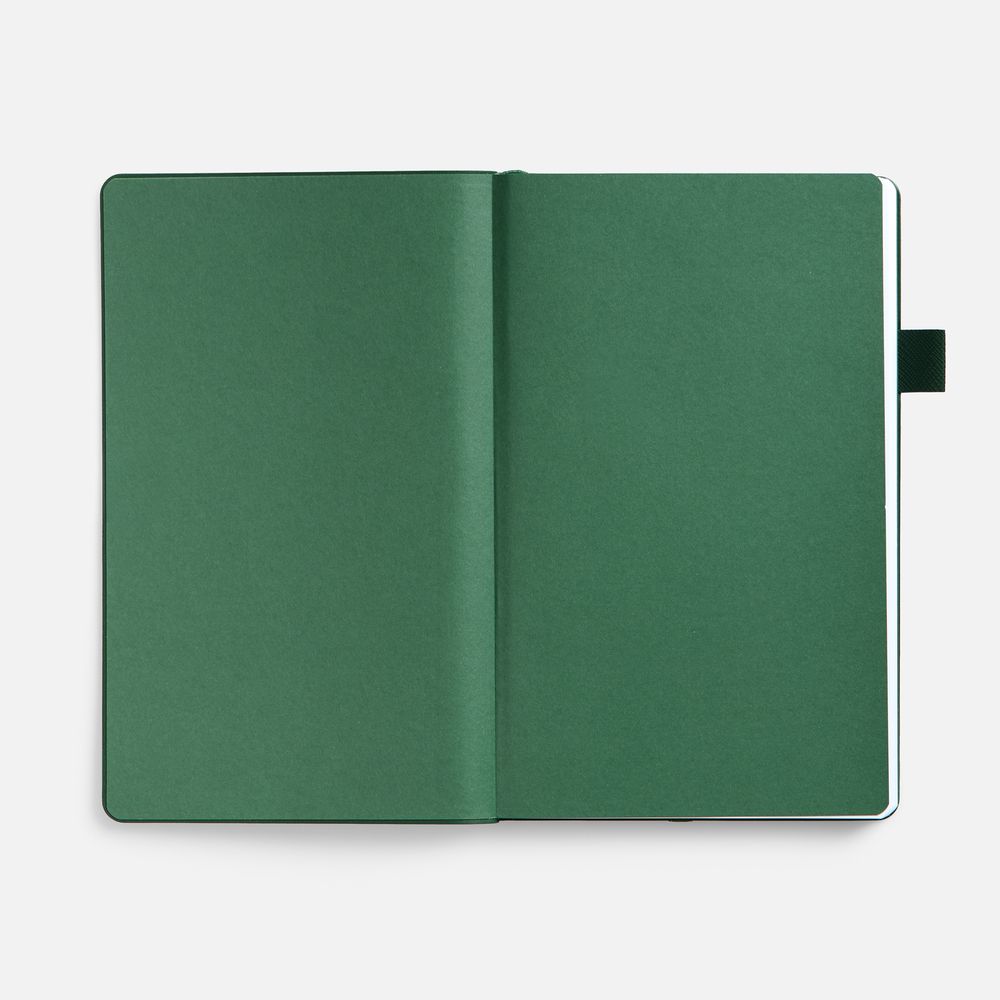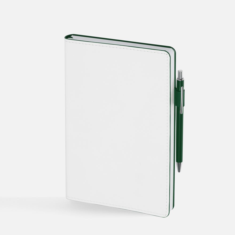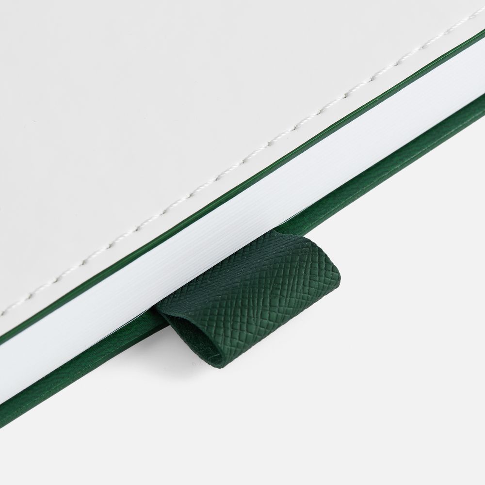 Гибкая обложка, материал обложки — Soft Touch, белый BB и Latte, зеленый FF; материал петли для ручки — Nice Touch, зеленый FF. Срез обложки окрашен в зеленый цвет.