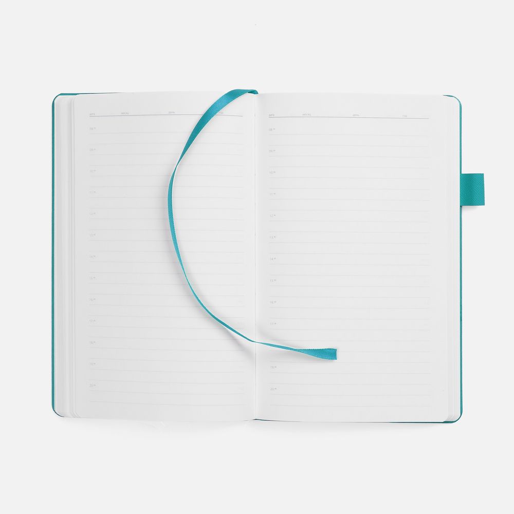 Гибкая обложка, материал обложки — Soft Touch, белый BB и Latte, цвета морской волны II; материал петли для ручки — Nice Touch, цвета морской волны II. Срез обложки окрашен в цвет морской волны.
