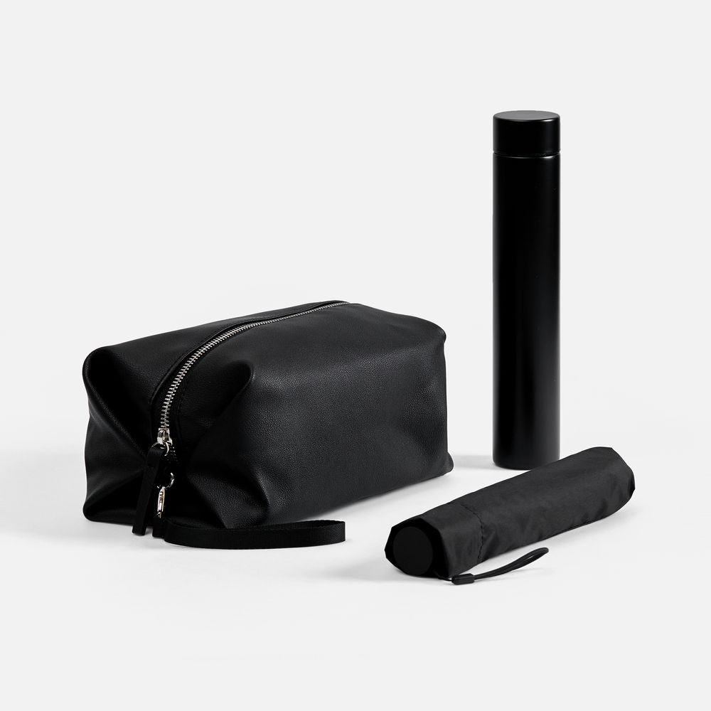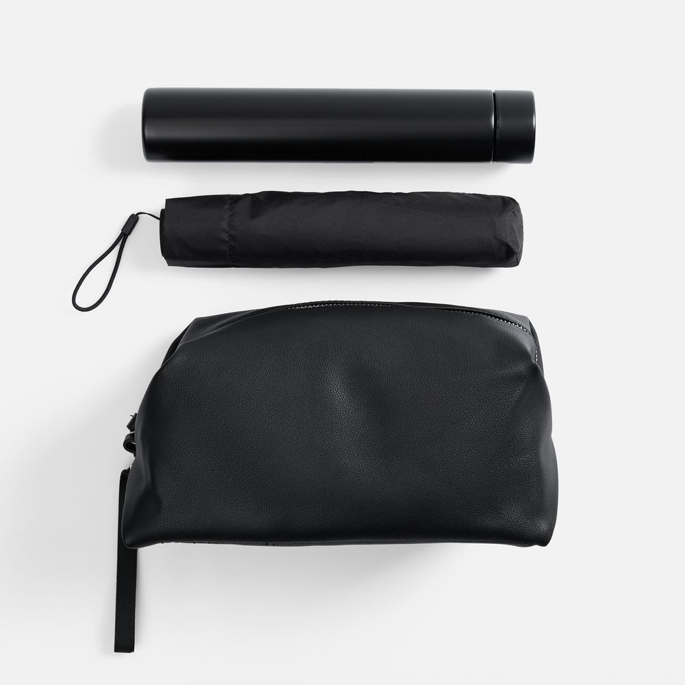 несессер - искусственная кожа; зонт - полиэстер, 300Т, спицы - стеклопластик; ручка - прорезиненный пластик; бутылка - нержавеющая сталь, 304 внутри, 201 снаружи; матовое покрытие
