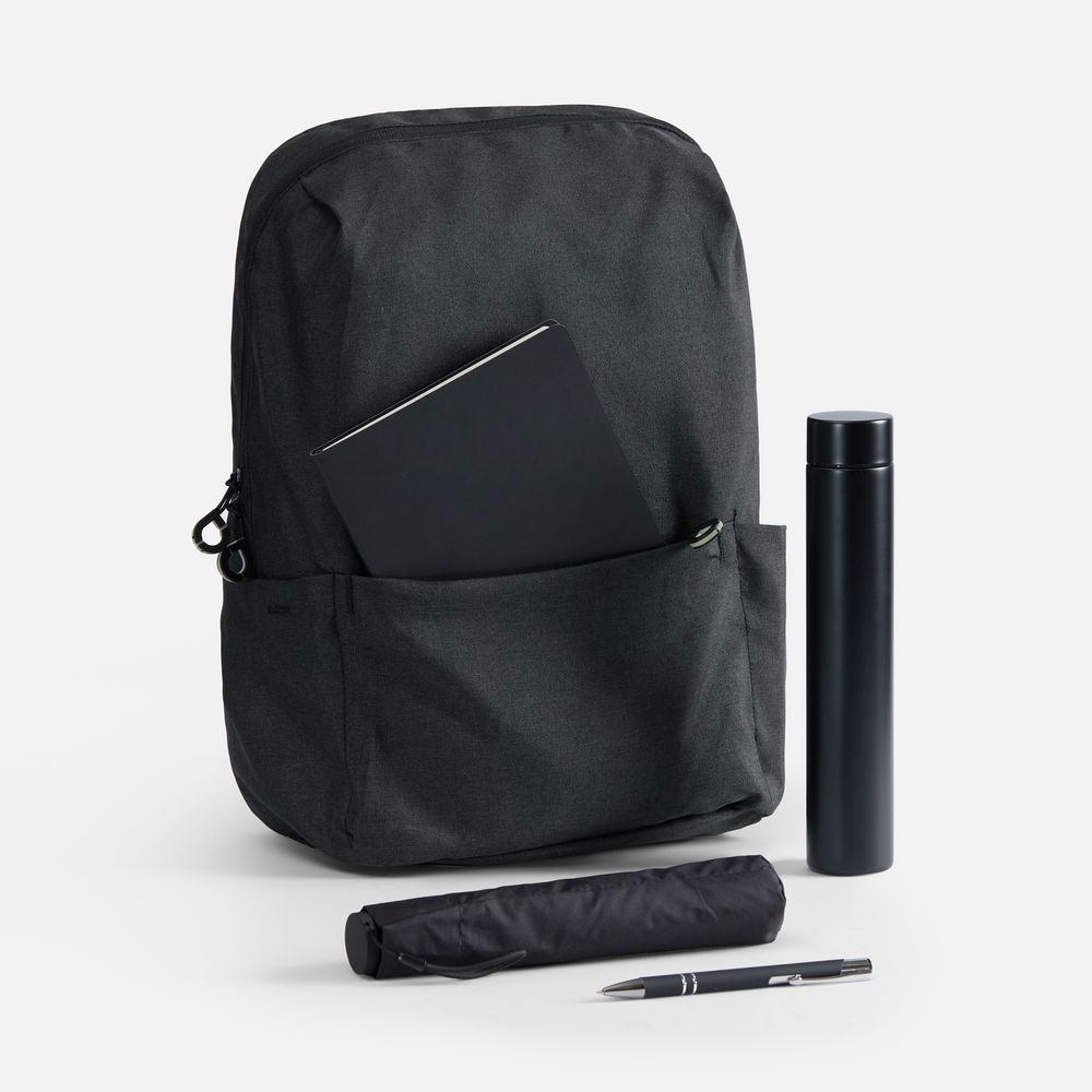 рюкзак - полиэстер, 300D; зонт - полиэстер, 300T; спицы - стеклопластик; ручка - прорезиненный пластик; бутылка - нержавеющая сталь, 304 внутри, 201 снаружи; матовое покрытие; крышка - пластик; ручка - металл; покрытие софт-тач