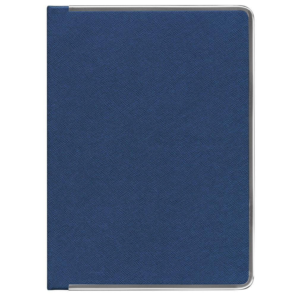 Ежедневник с твердой обложкой и серебристым обрезом, выполнен из материала Saffian, синий, дополнен серым ляссе и металлическими рамками.