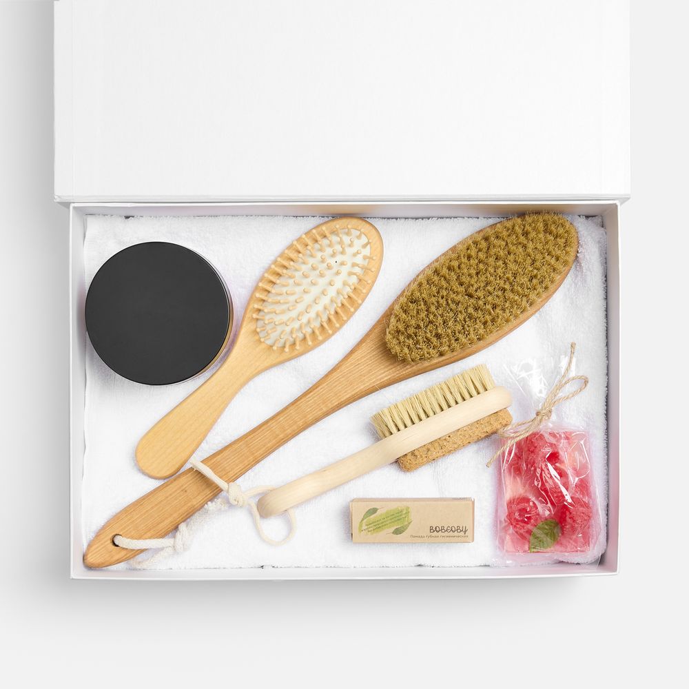 полотенце - хлопок 100%; щетки и расческа - дерево; коробка - переплетный картон