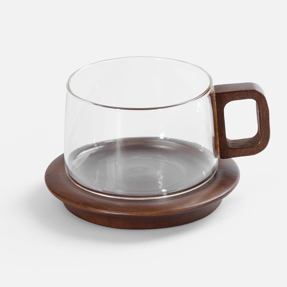 Прозрачное стекло подчеркивает цвет чая, кофе или травяного сбора, удобная деревянная ручка не нагревается и комфортно лежит в руке, а подставка-блюдце защищает стол от капель и добавляет эстетики.