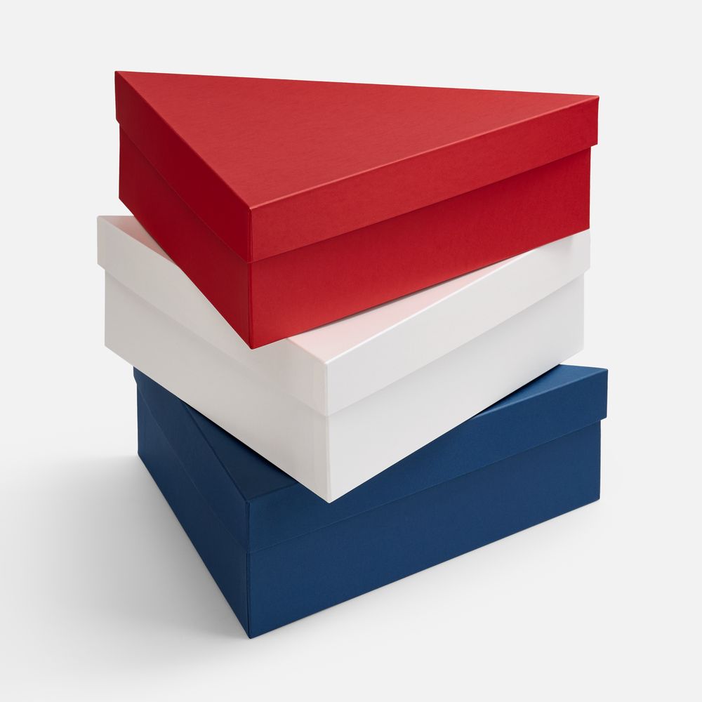 Трехгранная коробка Trigon прекрасно подходит для упаковки набора из 6 елочных шаров диаметром 10 см, а также других подарков нестандартной формы.
