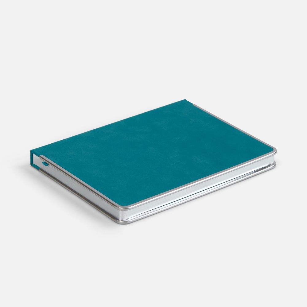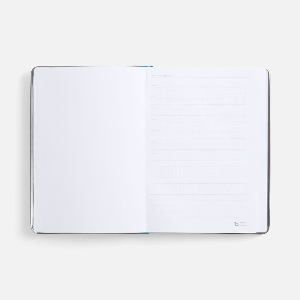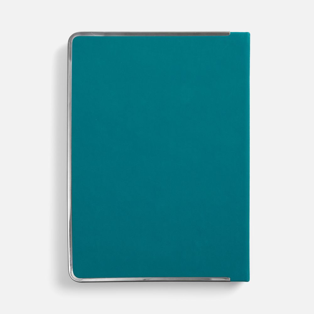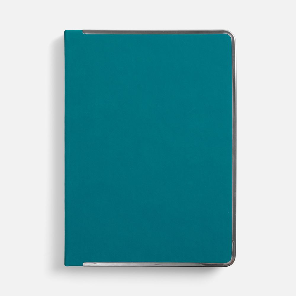 Ежедневник с твердой обложкой и серебристым обрезом блока. Выполнен из материала Nubuck, цвет мроской волны, дополнен цветным ляссе и металлическими рамками с двух сторон обложки.