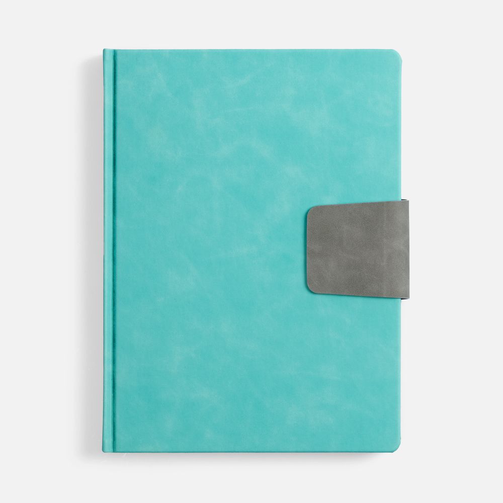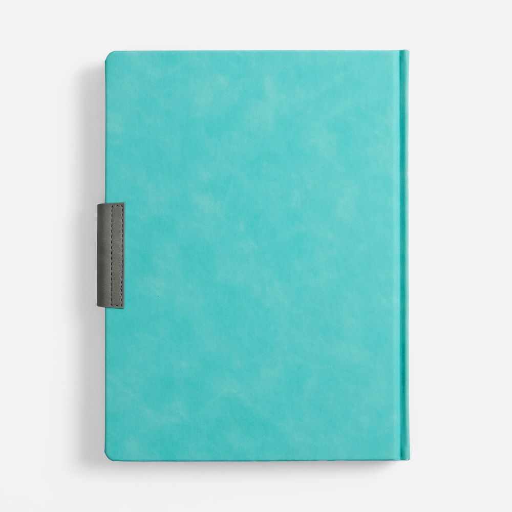 Ежедневник с твердой обложкой, выполнен из материала Nubuck Touch, цвет морской волны II, дополнен капталом, ляссе и обрезом серого цвета. Застежка — хлястик на магните из материала Nubuck Touch, серый СС.