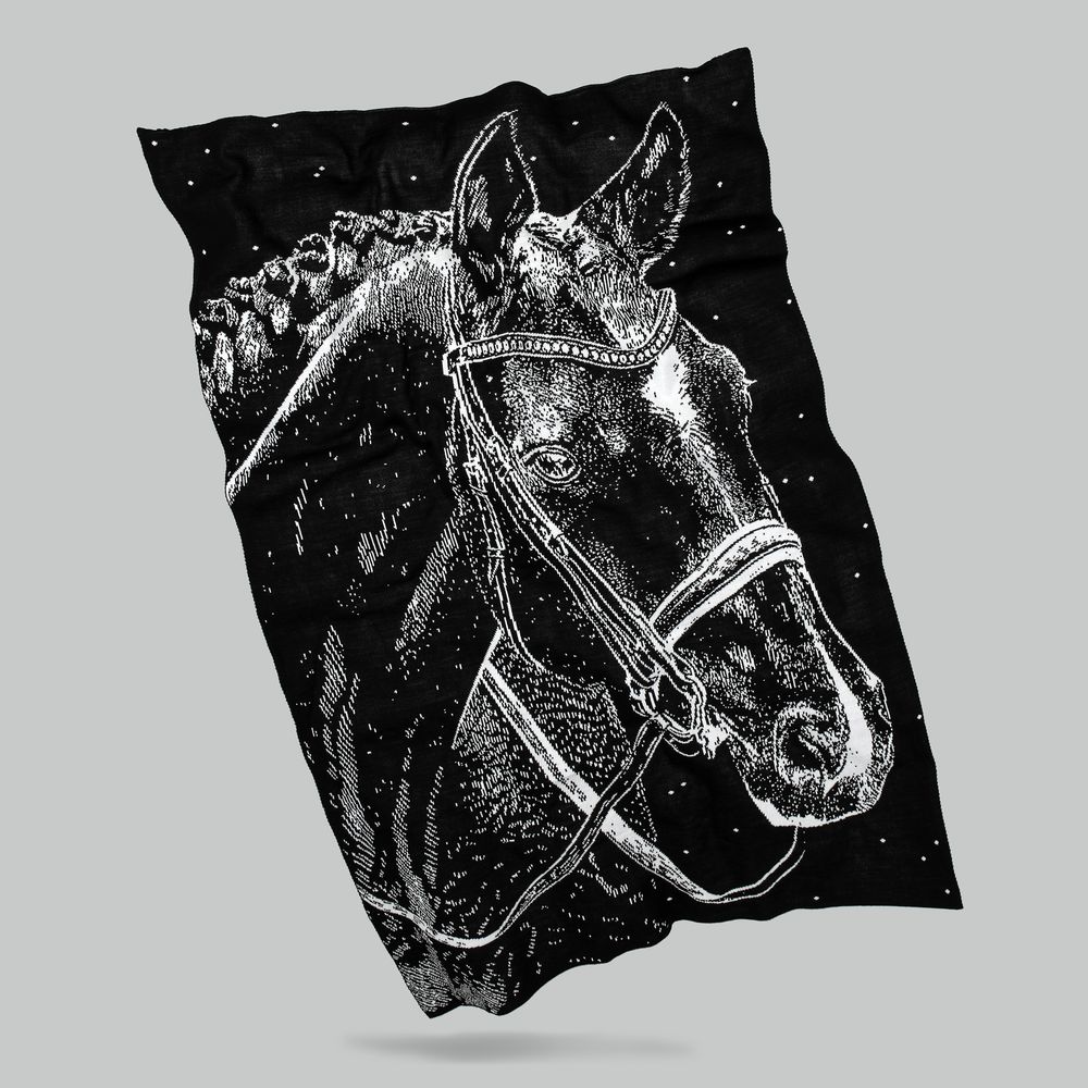 Черно-белое исполнение в узнаваемом стиле старинной гравюры моментально переносит в мир былин и сказаний, напоминая о том, что с давних времен лошадь — верный друг и защитник человека, доблестный и величественный. Конь подобной масти символизирует мудрость и благородство, а также гармоничное сочетание силы и грации.