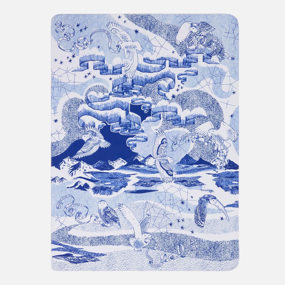 Бескрайний простор Севера, горный пейзаж, созвездия и всполохи Северного сияния в окружении вереницы мудрых сов — настоящая магия происходит на пледе «Чудеса прилетели»! Чудеса эти несут в себе отдельные смыслы: у совушек в клювах длинные листочки с пожеланиями и заветами на будущий год.