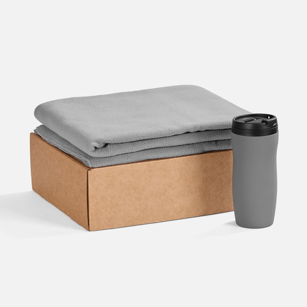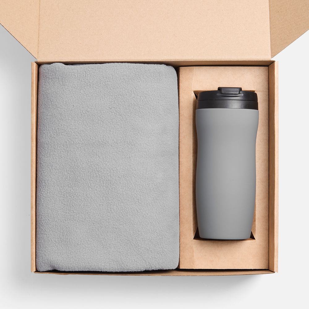 крышка, внутренняя колба - пластик; корпус - нержавеющая сталь; покрытие софт-тач; плед - флис, плотность 180 г/м²; коробка - микрогофрокартон, Т-23Е