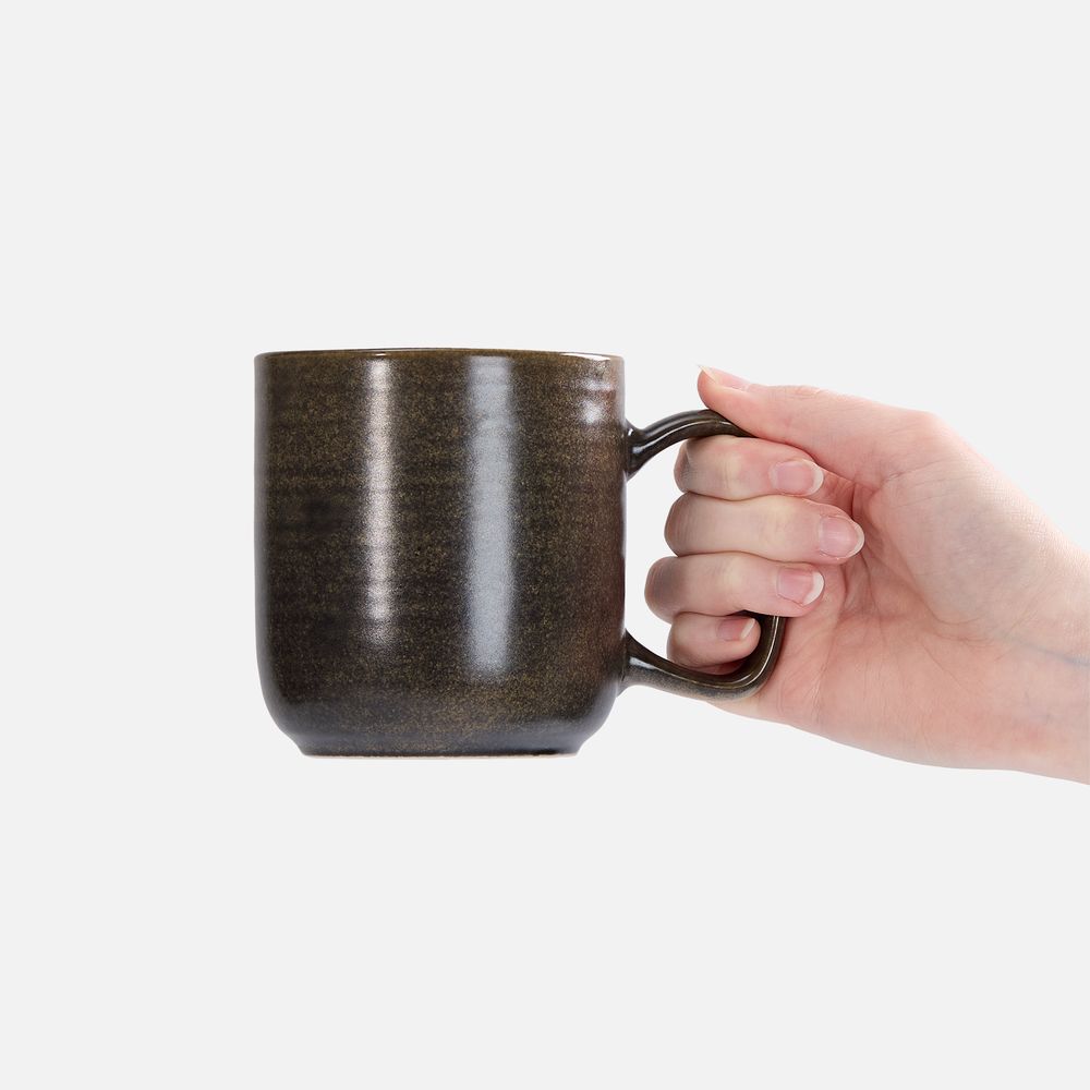 Классический цилиндрический корпус с матово-сатиновой поверхностью мелкой зернистости удобен для нанесения. Большая округлая ручка позволяет держать кружку всеми пальцами.