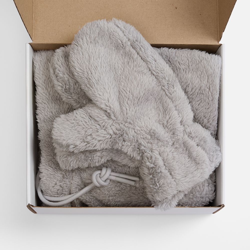балаклава - полиэстер 100%, плотность 280 г/м², длинноворсовый флис; варежки - полиэстер 100%, плотность 280 г/м², длинноворсовый флис; коробка - микрогофрокартон, плотность 385 г/м²