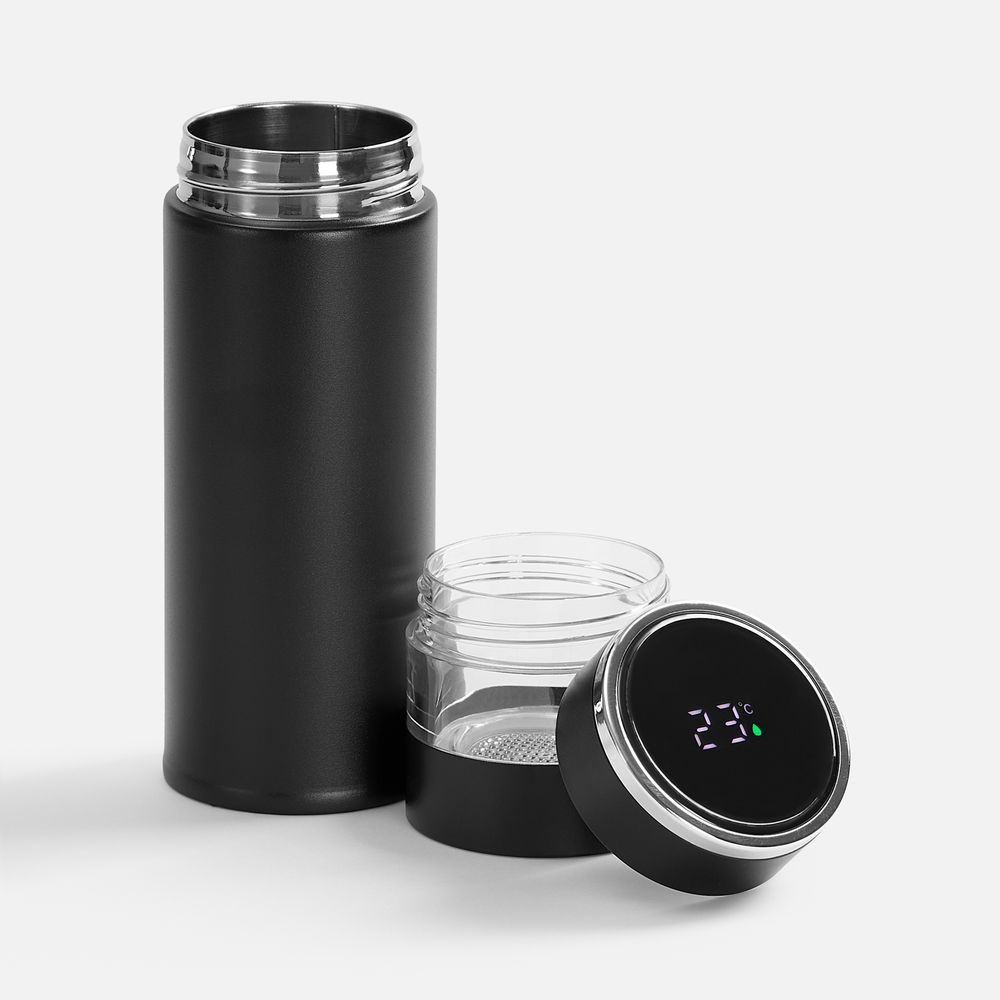 Умная термобутылка для заваривания Thermory отображает температуру жидкости на ЖК-дисплее: точные данные собирает встроенный в крышку датчик. Стенки из нержавеющей стали и вакуумная изоляция корпуса сохраняют напитки горячими (60 °C) в течение 8 часов или прохладными (10 °C) в течение 12 часов.
