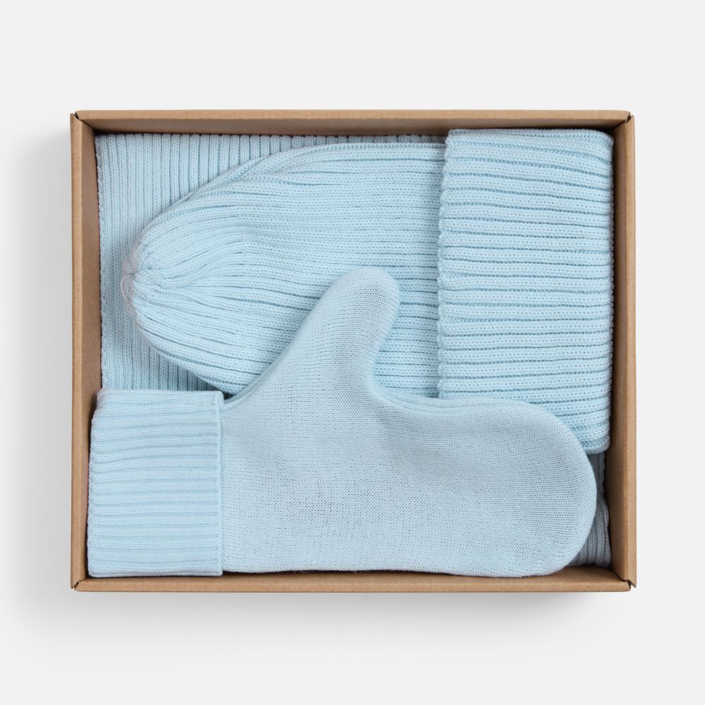 В набор входят удобный шарф с технологичным отверстием для быстрого завязывания, шапка с двойным отворотом и теплые двухслойные варежки с широкой манжетой. Все изделия связаны из акриловой пряжи, отличаются практичностью и элегантной простотой.
