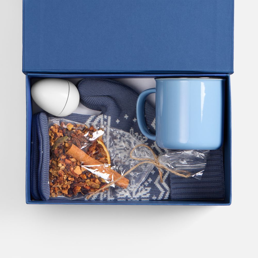 варежки - акрил 100%; футляр для бальзама - пластик; кружка - фаянс; плетеная фигурка - бумага; коробка - переплетный картон, бумага Malmero «Скандинавский синий»