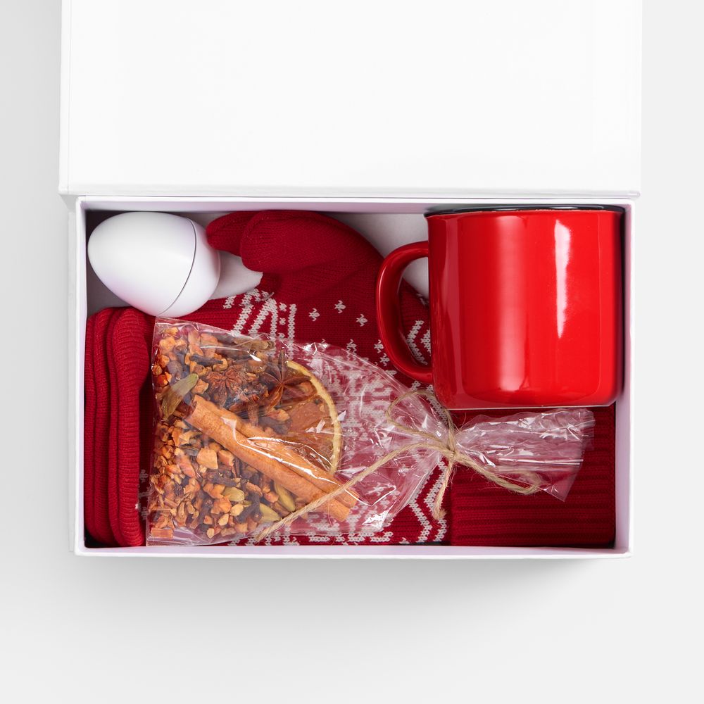 варежки - акрил 100%; футляр для бальзама - пластик; кружка - фаянс; коробка - переплетный картон, бумага Season Touch