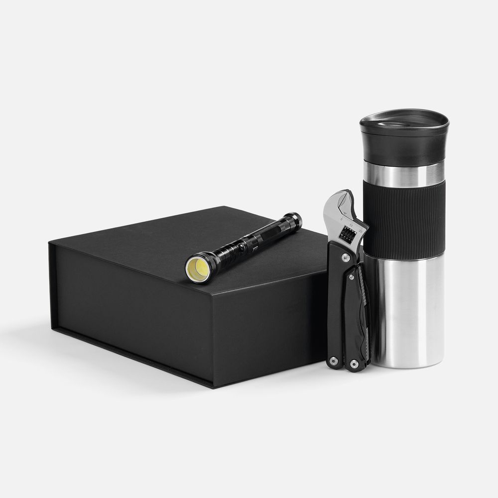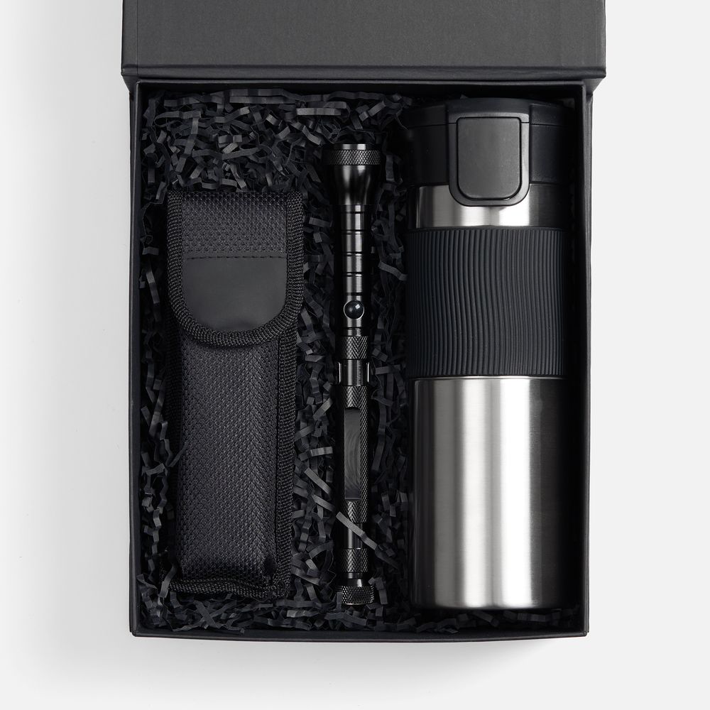 Компактный мультитул, гибкий фонарь и большой герметичный термостакан — все, что нужно для ремонта, строительства или работы в гараже. Емкость термостакана 450 мл.
