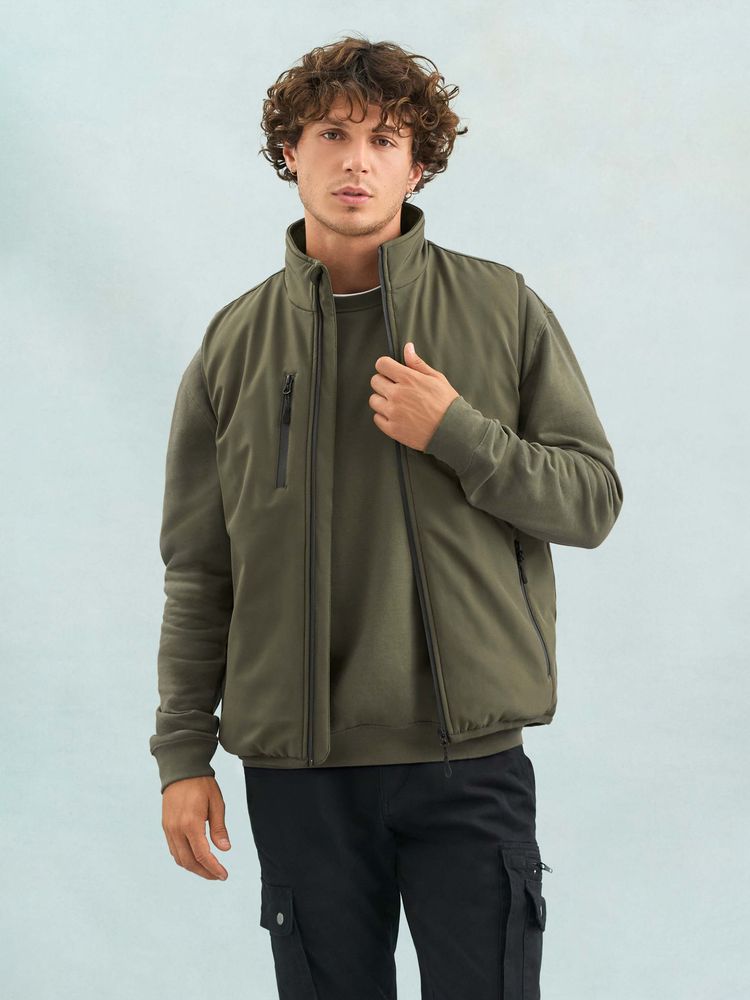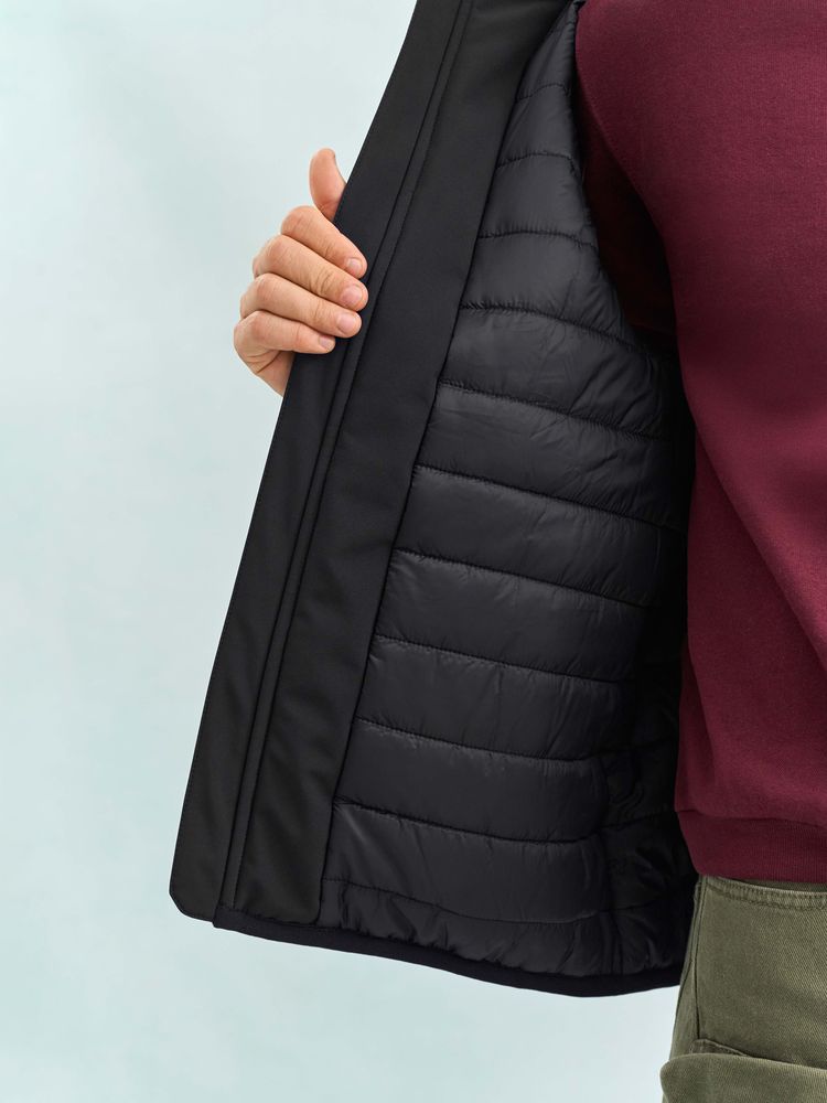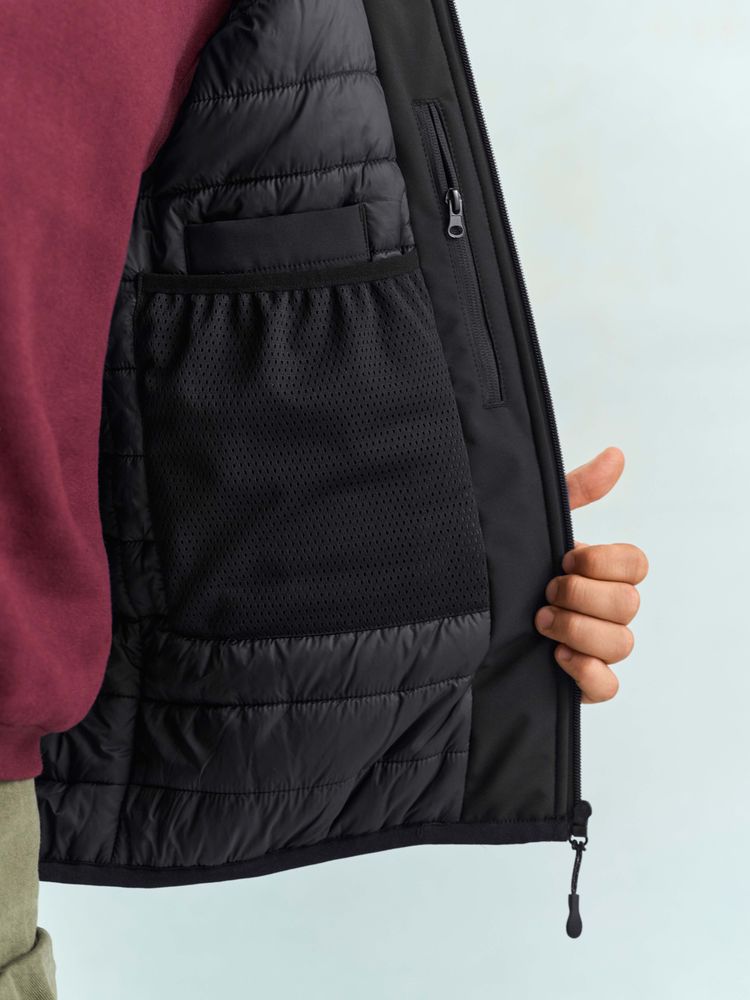 верх - переработанный полиэстер, 94%; эластан 6%, плотность 270 г/м²; софтшелл; подкладка - нейлон 100%; утеплитель - переработанный полиэстер, 100%