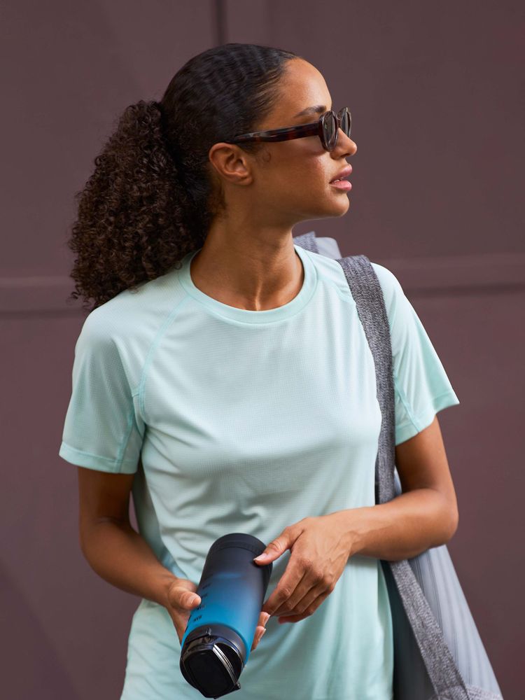 Женская спортивная футболка из дышащего и быстросохнущего материала. Приятная на ощупь и легкая ткань не стесняет движений.