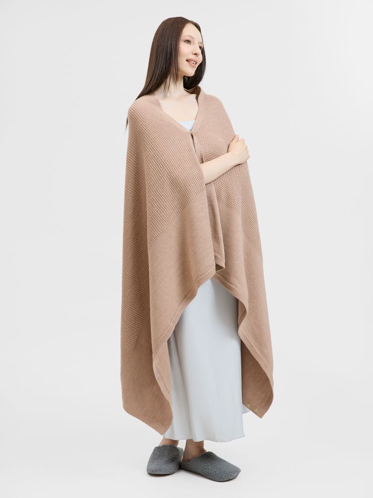 Плед Voyage соткан из мягкого сочетания шерсти и акрила — нежный, теплый и невесомый, он идеален для уютных вечеров. Кнопка позволяет превратить его в элегантную накидку, когда воздух становится прохладнее.