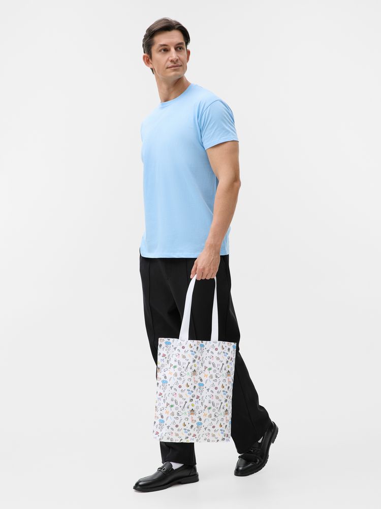 Особенность сумки — материал с биверным (саржевым) переплетением: синтетические нити выведены на лицевую сторону, а хлопковые — на изнаночную. Это сочетание дает одновременно прочность и комфорт в использовании, обеспечивая высокую износостойкость и длительный срок службы, а также позволяет выполнять на ней нанесение методом сублимации.
