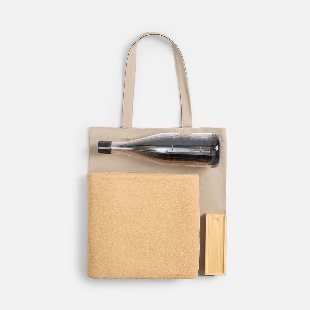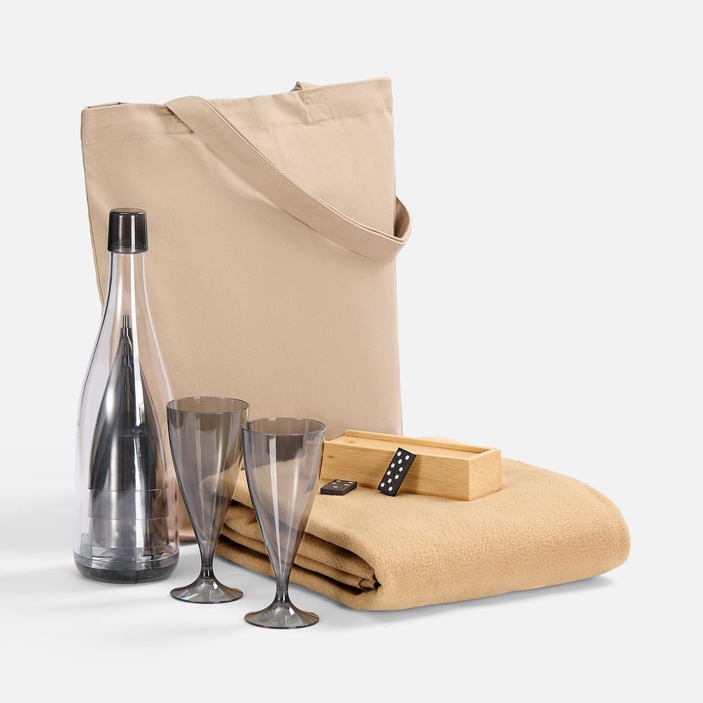 плед - флис, плотность 180 г/м²; набор бокалов - пластик; футляр для домино - бамбук; костяшки - МДФ; сумка - хлопок 100%, плотность 220 г/м²; саржа