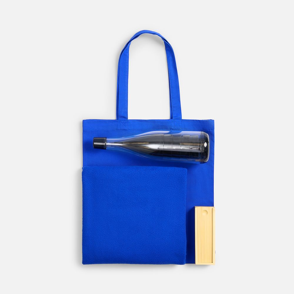 плед - флис, плотность 180 г/м²; набор бокалов - пластик; футляр для домино - бамбук; костяшки - МДФ; сумка - хлопок 100%, плотность 220 г/м²; саржа