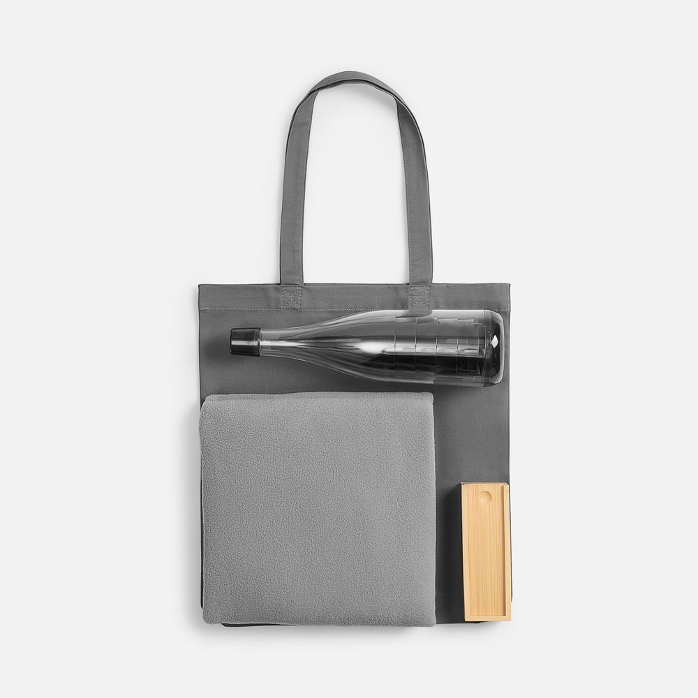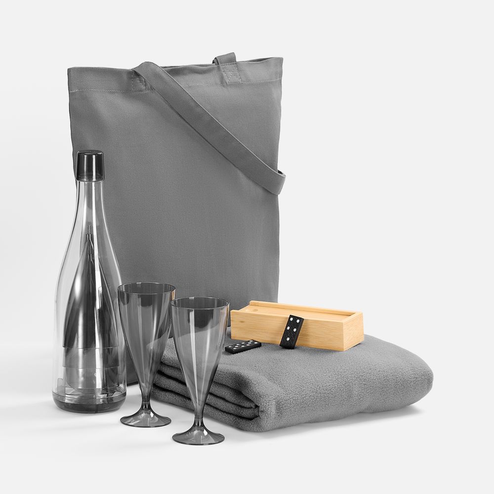 плед - флис, плотность 180 г/м²; набор бокалов - пластик; футляр для домино - бамбук; костяшки - МДФ; сумка - хлопок 100%, плотность 220 г/м²; саржа