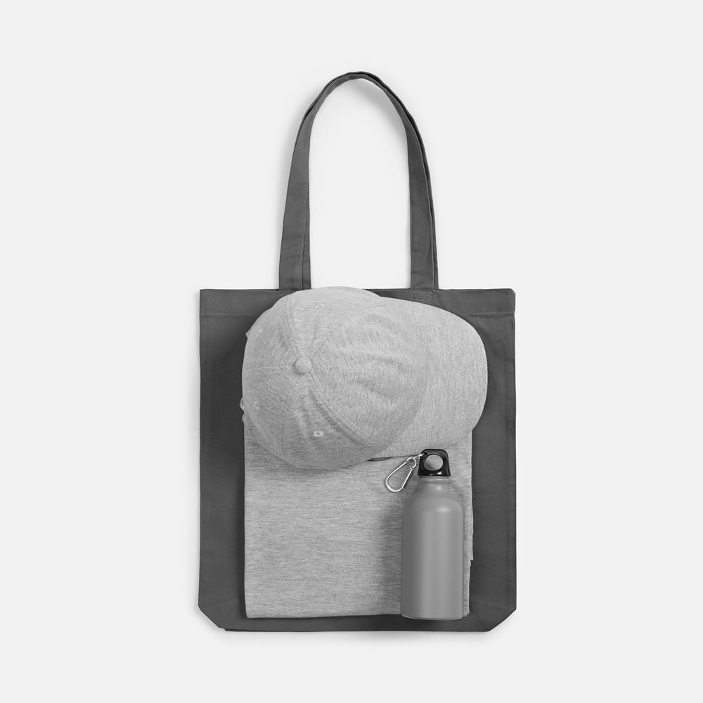 футболка - хлопок 100%, гребенная пряжа (пенье), плотность 160 г/м²; джерси; бейсболка - полиэстер, 75%; хлопок, 25%, плотность 170 г/м²; джерси; бутылка - алюминий; крышка - пластик; сумка - хлопок 100%, плотность 220 г/м²; саржа