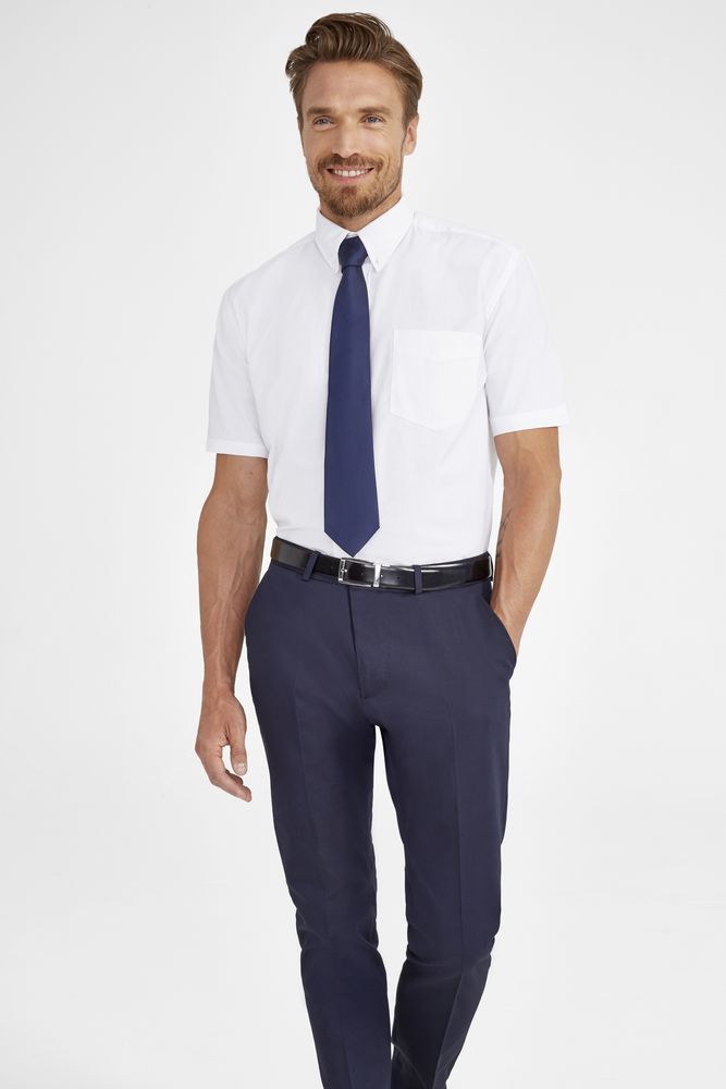 Рубашка из ткани «Оксфорд» с нагрудным карманом слева. На спинке две симметричные складки, воротник на двух пуговицах, регулируемые манжеты, планка с семью пуговицами в тон.