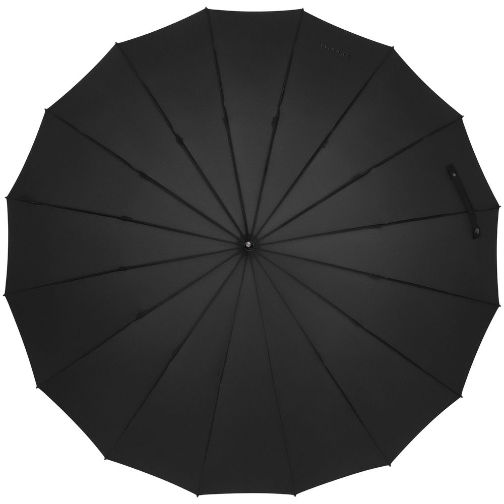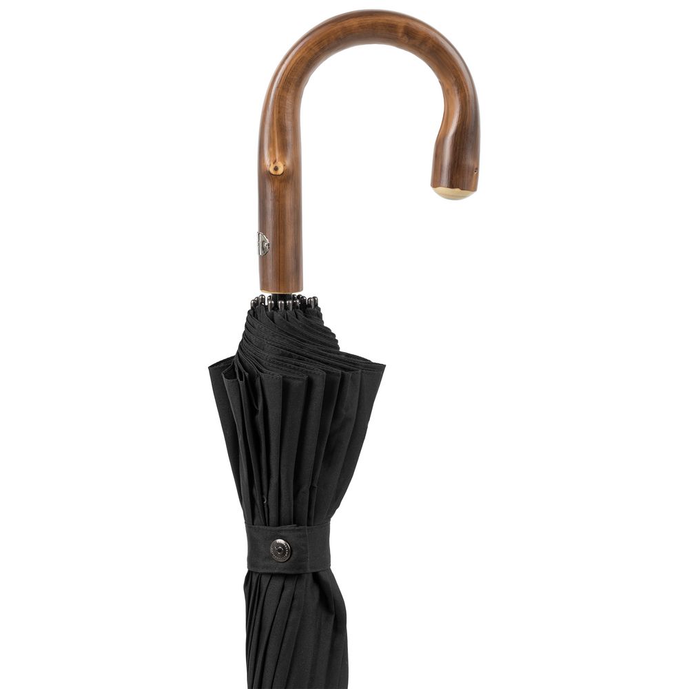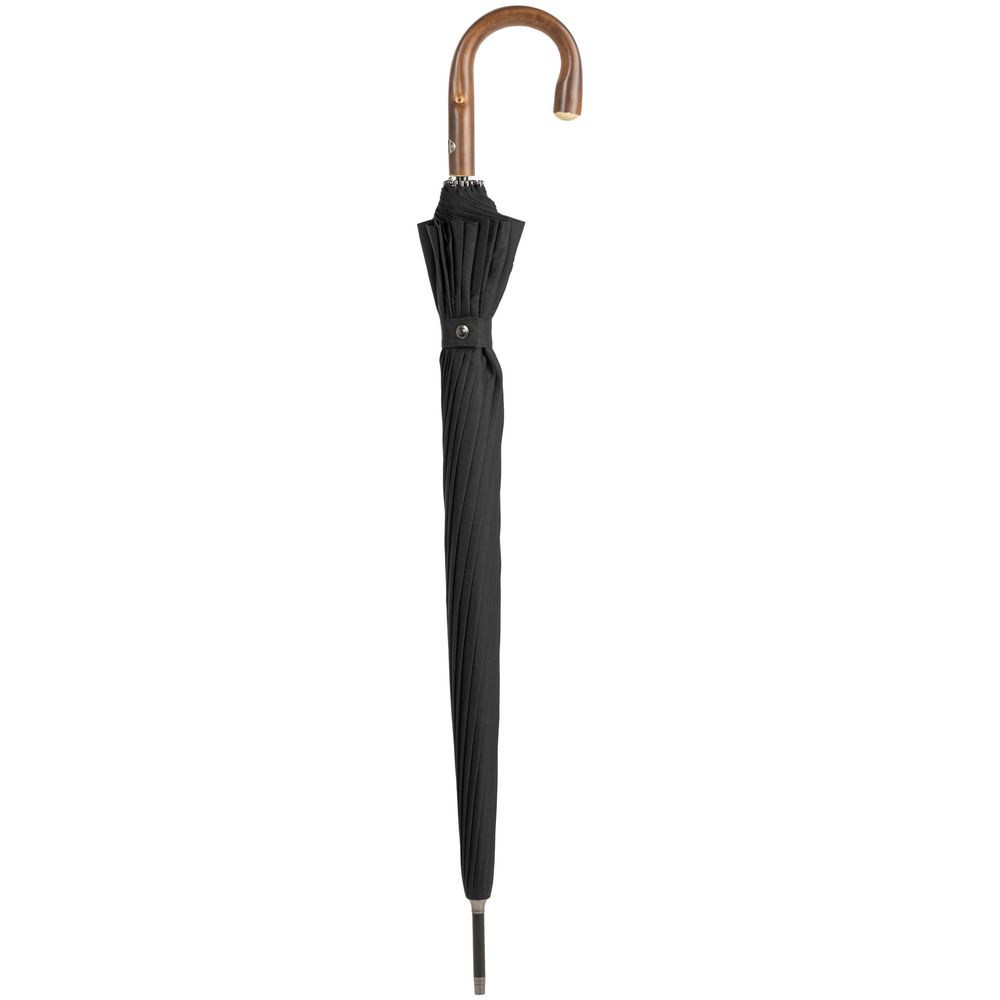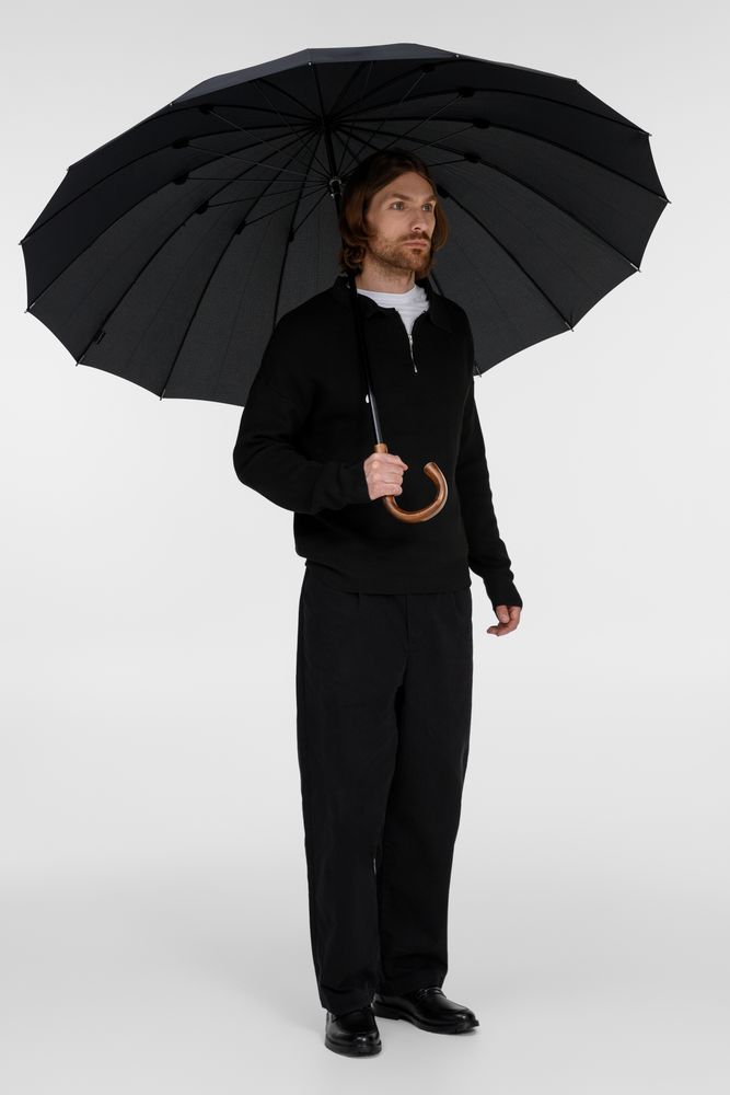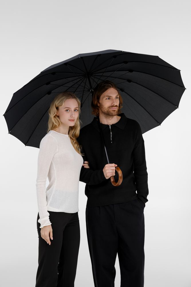 Солидный изысканный зонт с ручкой из дерева и 16 спицами. Большой купол легко укроет от дождя сразу двоих, а надежная конструкция выдержит даже сильный ветер.