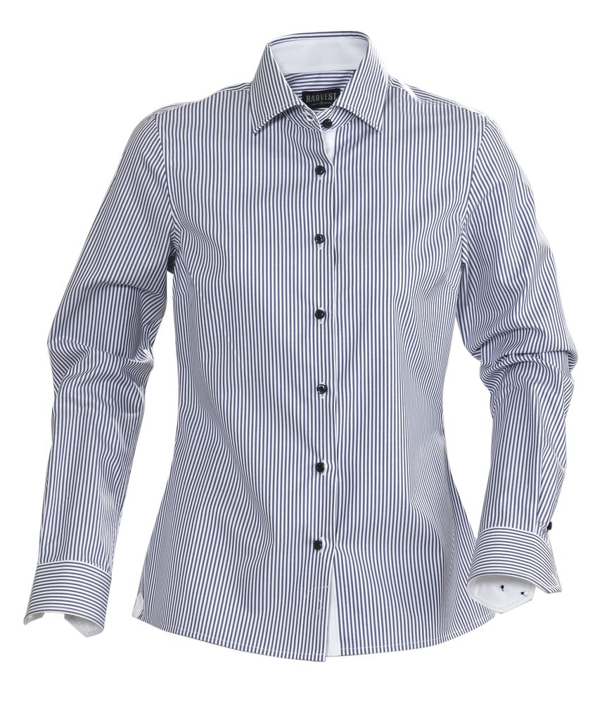 Приталенная женская рубашка из гребенного хлопка качества Easy Care (легко утюжить). Классический узор в полоску с контрастной отделкой оборотной части воротника, изнанки манжет и планки пуговиц. Упрочненные швы воротника и манжет.