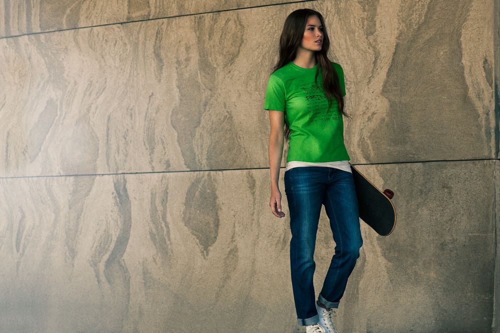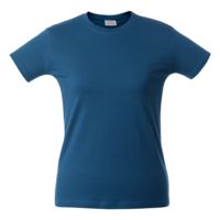 Женская футболка с уплотненными швами на плечах и двойным швом с эластаном. Четырехслойная резинка на воротнике предохраняет его от растяжения.