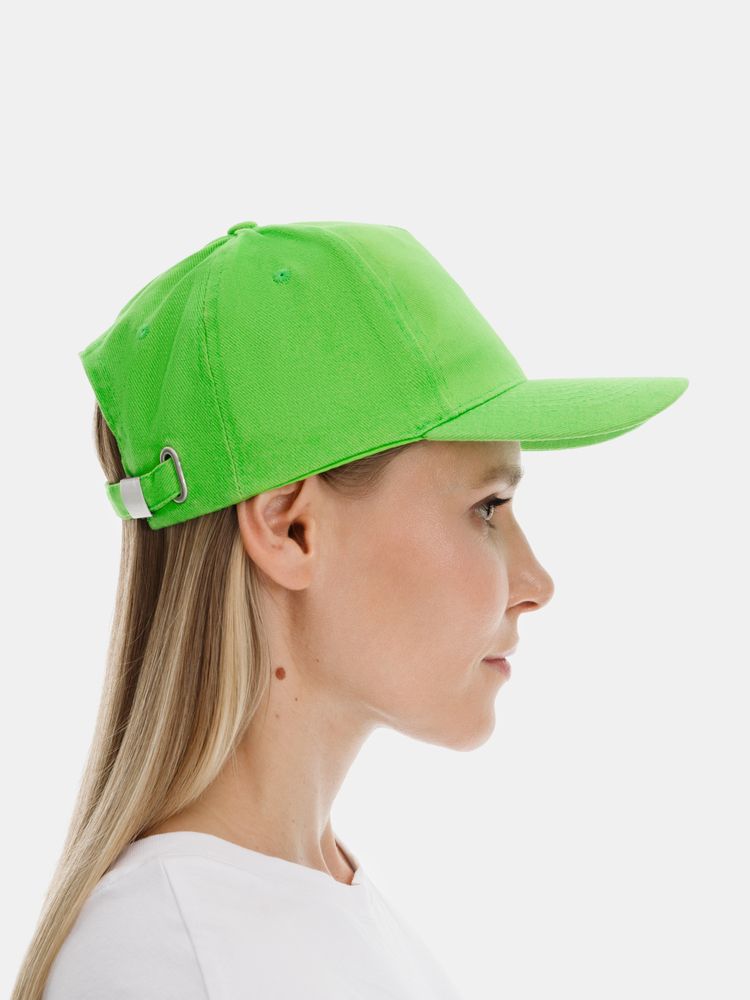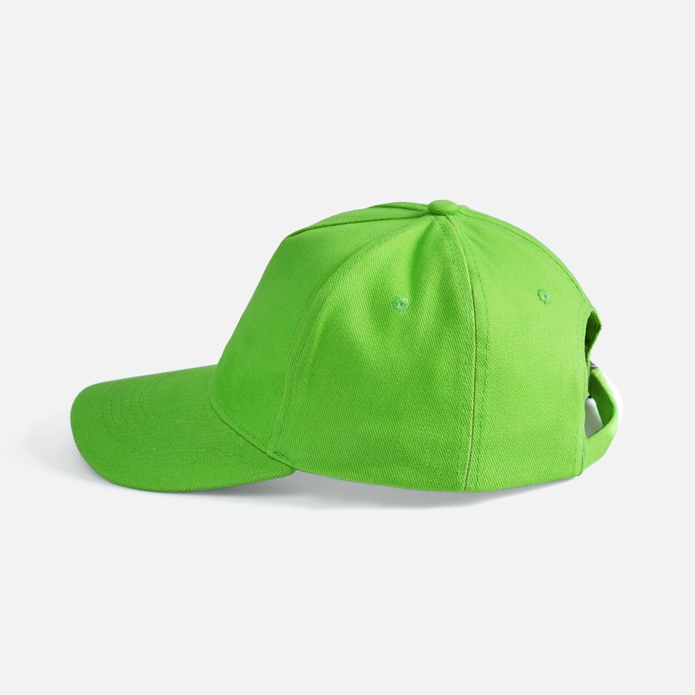 Модель бейсболки с 5-ю клиньями без лобового шва из плотного чесаного хлопка.