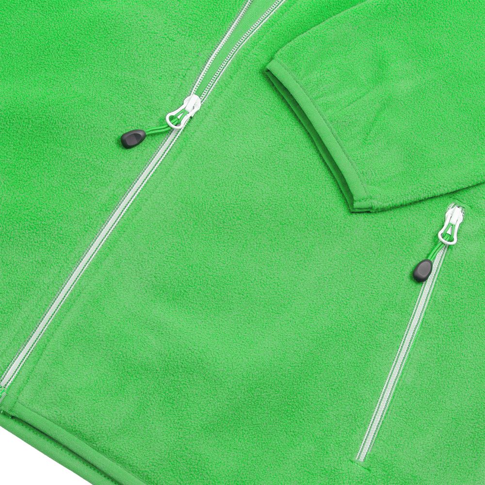 Толстовка из микрофлиса. Передние карманы на молнии, манжеты и низ куртки на тонкой резинке, застежка-молния контрастного цвета.