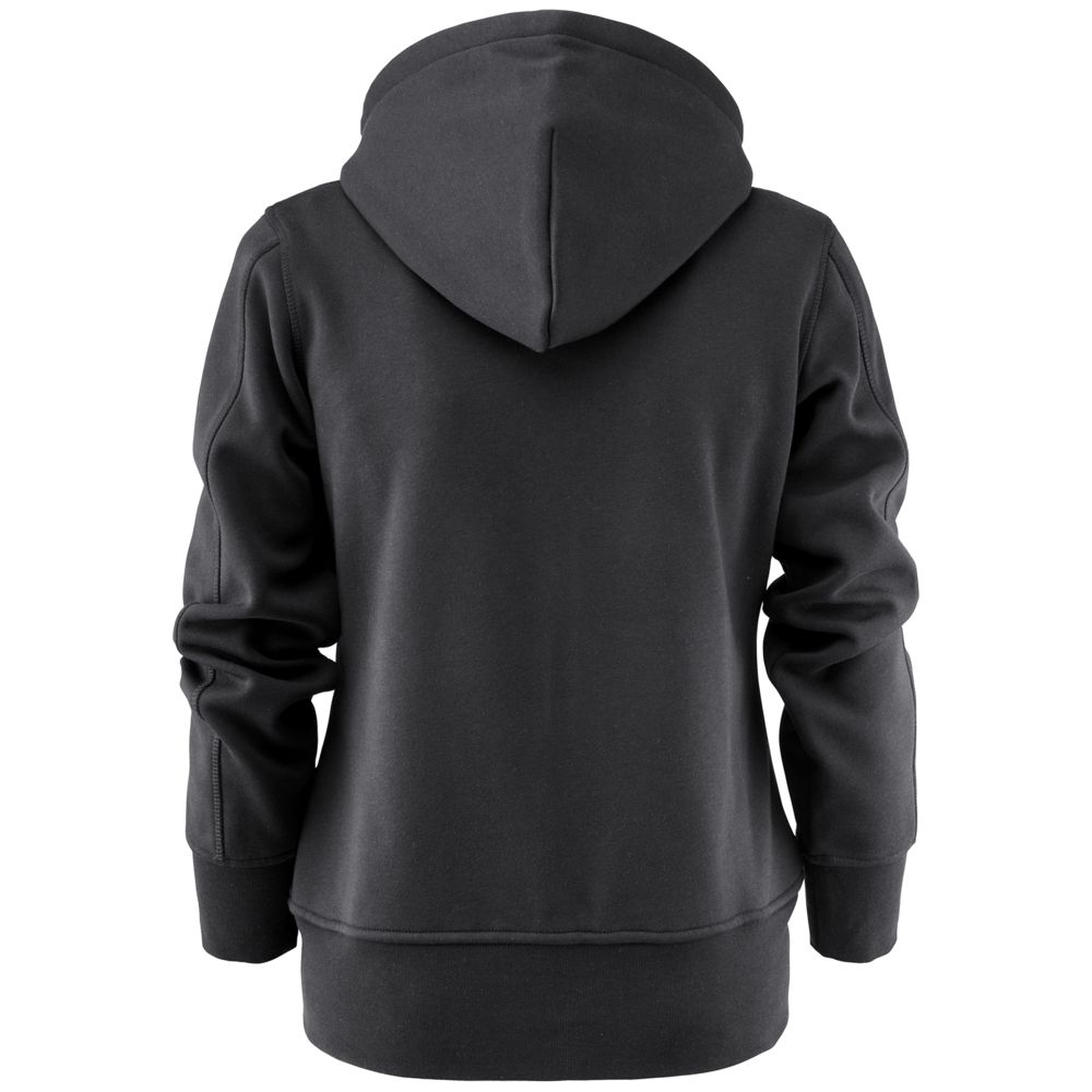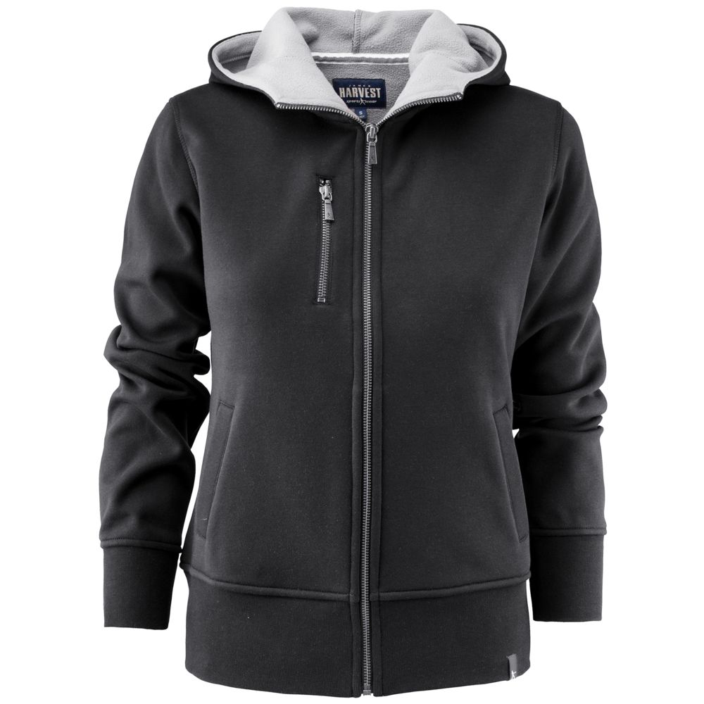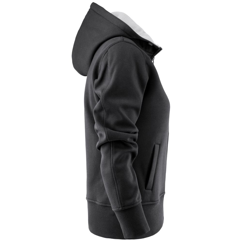 Женская толстовка на молнии с капюшоном. Изготовлена из комбинации двух материалов: снаружи — качественный хлопок, внутри — флис серого цвета. Уплотняющая резинка вокруг манжет и по низу. Два боковых и два внутренних кармана, карман с молнией на груди.
