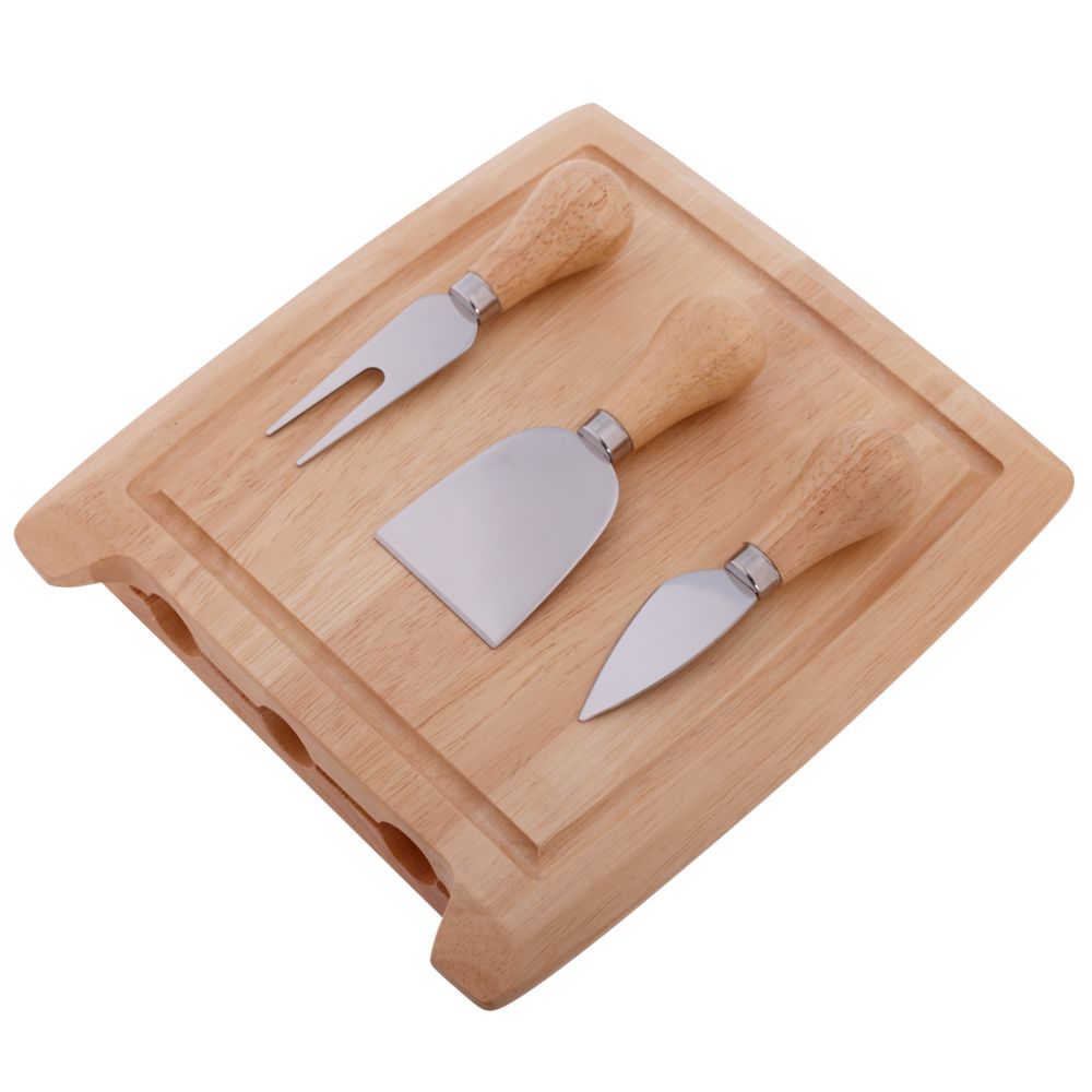 Доска и рукоятки ножей выполнены из каучукового дерева, лезвия — из высококачественной нержавеющей стали.